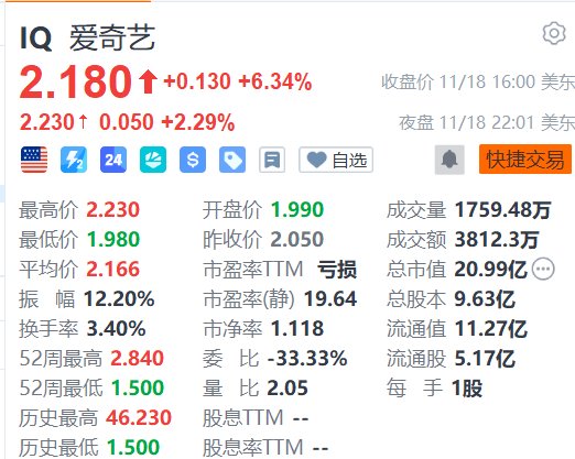 | IQ 爱奇艺 | | | | --- | --- | --- | | 2.180 + +0.130 +6.34% | | 收盘价 11/18 16:00 美东 | | 2.230 + 0.050 +2.29% | | 夜盘 11/18 22:01 美东 | | 二 2 24 2 5 8 目 ♥ 白 ♥ 白 ♥ 白 | | ● 快捷交易 | | 最高价 2.230 | 开盘价 1.990 -- | 成交量 1759.48万 | | 最低价 1.980 | 昨收价 2.050 | 成交额 3812.3万 | | 平均价 2.166 | 市盈率TM 亏损 | 总市值 20.99亿 (…) | | 振 幅 12.20% | 市盈率(静) 19.64 | 总股本 9.63亿 | | 换手率 3.40% | 市净率 1.118 | 流通值 11.27亿 | | 52周景高 2.840 | 委 比 -33.33% | 流通股 5.17亿 | | 52周最低 1.500 | 量 比 2.05 | 色 主 1股 | | 历史最高 46.230 | 股息TIM -- | | | 历史最低 1.500 | 股息率ITM -- ...