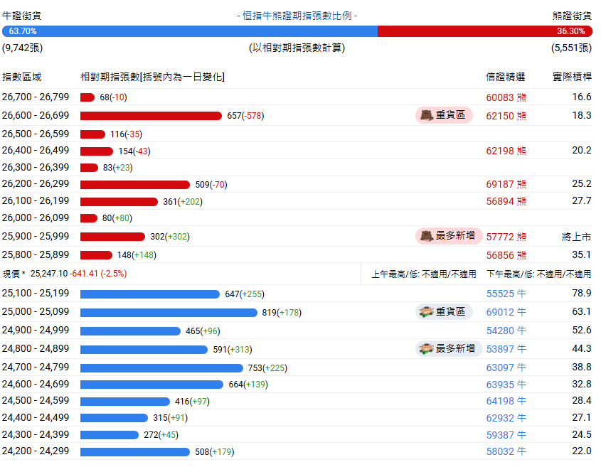 牛证街货重货区在25000-25099区间,该区间最新牛证数量为819张,较上一交易日增加178张;牛证街货最多新增在 24800-24899区间,该区间最新牛证数量为591张,较上一交易日增加313张。 智通财经APP获悉,截至10月18日,恒指最新的牛熊街货比例为64:36。 | 牛證街貨 | | | | | | 能證街貨 | - 恒指牛熊證期指張數比例- | | | | --- | --- | --- | --- | --- | --- | --- | --- | --- | --- | | 63.70% | | | | | | 36.30% | | | | | (9,742張) | | | | (以相對期指張數計算) | | (5,551張) | | | | | 指數區域 | 相對期指張數[括號內為一日變化] | | | | | 信證精選 實際槓桿 | | | | | 26,700 - 26,799 | 68(-10) | | | | | 16.6 60083 龍 | | | | | 26,600 - 26,699 | | | | | 657(-578) | 題如果 18.3 62150 能 | | ...