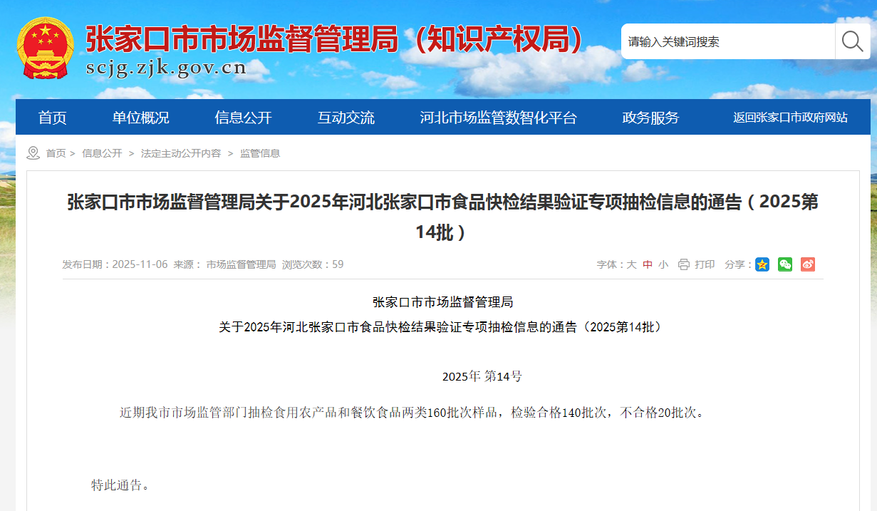 河北省张家口市市场监督管理局关于2025年河北张家口市食品快检结果验证专项抽检信息的通告(2025第14批)