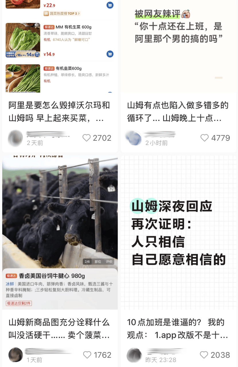 花儿街参考 · 出品 作者 | 林默 1 2023年的时候,盒马贴着山姆,搞过一波"移山价",当时山姆会员店的千层榴莲蛋糕卖128,盒马搞出 了99一块的同款。山姆的牛腩卖99.8,盒马把价格打到了79.9。 那波移山,盒马应该是花了不少钱。 2025年,在阿里已经放下了山姆,卖掉大润发、卖掉银泰,盒马想着各种办法去搞盈利的时候。一场山 姆的话题,以阿里前高管刘鹏为抓手,就在阿里的地面上烧到了闭环。 世界何等幽默。你花了那么多钱,想去个山头上撬几块石头的时候,对面那座山好像也没有动一动。等 你以为自己已经走出了那片山区,那个山头上的巨石,忽然就松动了,而且一路咣咣当当就砸到了你的 头上。 2 这块巨石,到底是怎么从山姆滚到阿里的? 山姆会员这一轮抗议逻辑是这样的——你们在APP里给商品美图了,核心信息也打码了,阿里前高管成 群结队地降临了,下一步就是换成他们自己的供应链了,我花260块钱的会员费,买的就是个优质买手 服务,现在你给我要给我换全套电商供应链? 到这儿,不是山姆会员的,可能还是有点儿懵,电商供应链和山姆供应链,核心差别是啥? 但是,为啥山姆会员倾向于用脚踢掉前阿里高管,社交媒体的互动中,那么多人愿 ...