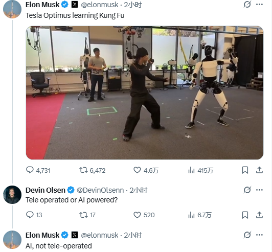 马斯克在X平台上发布特斯拉擎天柱机器人学习功夫的视频。一位网友问:"远程操作还是AI驱动?"马 斯克回应称:"AI,并非远程操作。" ...