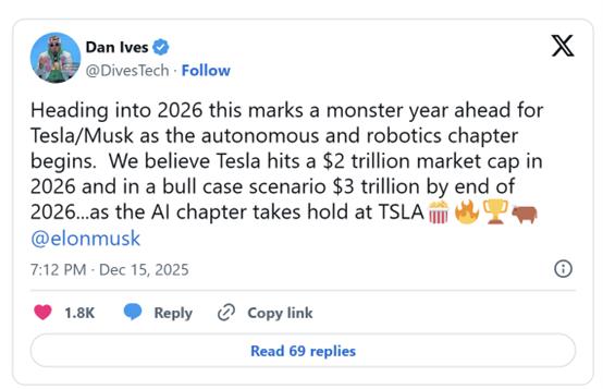 上周末,至少有两辆特斯拉Model Y被发现在没有安全监督员或任何其他乘员的情况下行驶在公共道路 上。 特斯拉首席执行官马斯克上周日晚些时候在X上证实,公司目前正在测试不配备人类安全员的无人驾驶 出租车。 "步入2026年,伴随自动驾驶与机器人业务篇章开启,特斯拉与马斯克将迎来爆发之年。我 们认为,随着AI篇章在特斯拉全面展开,公司2026年市值将达2万亿美元,乐观情境下, 2026年底市值有望冲击3万亿美元。" 同时,艾夫斯还重申了对特斯拉股票的 "跑赢大盘" 评级,并维持对该股600美元的目标价。 周一,特斯拉逆势上涨超3%,报475.31美元,市值接近1.5万亿美元。特斯拉最近在德克萨斯州奥斯汀 市进行无人驾驶汽车测试助长了市场的乐观情绪。 美国知名投行韦德布什(Wedbush Securities)的董事总经理、知名科技分析师丹·艾夫斯(Dan Ives)坚 定看好特斯拉的长期上涨前景。该分析师周一在X上发文称,由于特斯拉努力开发和推动其人工智能 (AI)项目,在乐观情境下,市值有望在2026年底冲上3万亿美元。 艾夫斯表示,随着自动驾驶和机器人业务逐步迈向商业化,特斯拉正在进入一个关键发展期。 他预 ...