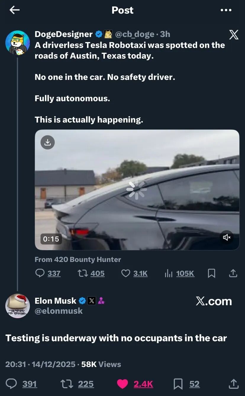 12月14日,一名X用户拍摄到一辆特斯拉Model Y在奥斯汀街头行驶的画面,车内似乎空无一人,甚至没 有配备安全监督员。 上周日(12月14日),一名X用户拍摄到一辆特斯拉Model Y在奥斯汀街头行驶的画面,车内似乎空无一人,甚至没 有配备安全监督员。 自特斯拉今年6月在奥斯汀推出无人驾驶出租车(Robotaxi)服务以来,副驾驶座位上一直都坐着一名安全监督员。 这段视频在网上引起了特斯拉关注者的极大兴奋,其中一些人甚至立刻打开打车软件下单,以验证接单的车辆是否仍 配备安全员(结果显示仍有安全员)。 特斯拉首席执行官埃隆·马斯克周日晚些时候对此回应称,公司目前正在测试不配备人类安全员的无人驾驶出租车,尽 管目前看来尚未向付费乘客开放。 "测试正在进行中,车内没有人,"马斯克在回复发布原始视频的X用户时写道。 特斯拉官方则以一句 "Just saying"("姑且一提")回应了这段视频。 特斯拉人工智能业务负责人Ashok Elluswamy也做出了回应。他在X上发文称:"就此启幕!" 据Robotaxi Tracker——由奥斯汀当地无人驾驶行业观察人士Ethan McKenna运营——的数据,目前特斯拉 ...