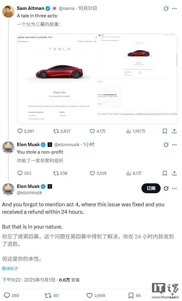 马斯克与奥特曼再起冲突:Roadster退款风波点燃新一轮口水战