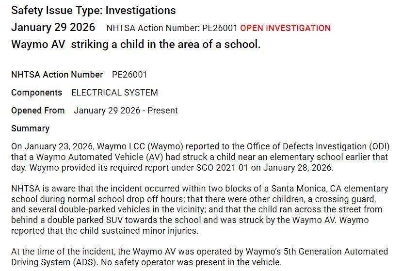 事故详情与安全评估 - 一辆Waymo第五代无人驾驶出租车在美国加州圣莫尼卡一所小学附近撞倒一名儿童,导致其受轻伤,事发时正值上下学高峰期,儿童从一辆违章停放的SUV后突然跑出[1][2] - 事故发生时车辆由自动驾驶系统控制,车内无安全员,系统检测到目标后立即采取紧急制动,将车速从约17英里/小时(27.4公里/小时)降至6英里/小时(9.7公里/小时)以下,最终以约9.7公里/小时的时速发生碰撞[1][5] - Waymo使用“同行评审模型”复盘,该模型模拟理想状态下全神贯注的人类驾驶员,结果显示在相同“鬼探头”情况下,人类驾驶员会以14英里/小时(约22.5公里/小时)的速度撞上行人,碰撞速度是Waymo此次事故的两倍多[6] 监管调查与公众反应 - 美国国家公路交通安全管理局已对事故展开初步评估,调查Waymo在小学附近及接送时段对未成年行人等弱势道路使用者是否采取适当谨慎措施[5] - 事故引发公众关注,此前Waymo已被曝出多次事故,包括闯入警匪对峙现场、在火车轨道上停车、多次违法超越校车等,针对违法超越校车的调查尚未结束[5] - 部分网友认为Waymo在此次事故中表现优于人类驾驶员,能减少伤害,并基于其超4000万英里(约6437万公里)累计行驶里程估算,其事故率远低于人类平均水平[7][8][10] 业务扩张与运营进展 - Waymo近期进入美国迈阿密开启Robotaxi运营,这是其在美国的第六个服务城市,此前在洛杉矶、旧金山、凤凰城、奥斯汀和亚特兰大已有共2500辆无人车上路[12] - 公司计划今年进军12座城市,并在已部署城市扩大运营范围,例如近期向部分用户开放旧金山国际机场的无人驾驶接送服务,未来几个月将拓展至所有用户[13] - Waymo已在圣何塞米内塔国际机场、菲尼克斯天港国际机场提供无人驾驶上下客服务,机场接送服务具有路程长、收入高、需求稳定的特点,有助于商业化和数据收集[13][15] 车队规模与新车发布 - 截至2025年12月,Waymo在洛杉矶、旧金山、凤凰城、奥斯汀、亚特兰大的Robotaxi车队规模分别为700辆、1000辆、500辆、200辆、100辆[13] - Waymo宣布今年将向公众提供第六代无人车服务,新车基于极氪平台打造,配备13个摄像头、6个雷达、4个激光雷达,传感器配有加热器、雨刮器和喷洒器[17] 国际化布局与竞争格局 - Waymo计划于今年第四季度在伦敦推出Robotaxi服务,实现首次正式出海,其第五代无人车已在伦敦博物馆展示[19] - 到今年年末,Waymo与中国的萝卜快跑将在伦敦市场首次正面交锋[21] 行业对比:特斯拉Robotaxi安全数据 - 根据NHTSA调查,在2025年7月至11月期间,特斯拉在得州报告了9起Robotaxi事故[22] - 截至2025年11月,特斯拉Robotaxi车队累计行驶里程约50万英里(约80.5万公里),据此计算其平均每行驶5.5万英里(约8.9万公里)发生一起事故[22] - 美国人类驾驶员平均每行驶50万英里发生一起警方记录在案的交通事故,特斯拉Robotaxi当前的事故率是普通人类驾驶员的9倍[24][25]
