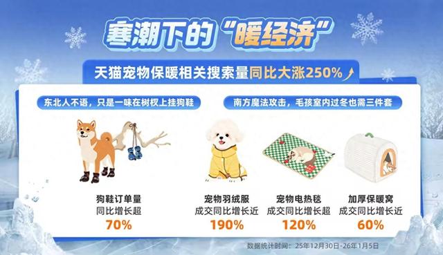 行业趋势:寒潮驱动宠物保暖消费需求激增 - 2026年首轮寒潮席卷全国,天猫平台宠物保暖相关搜索量同比大涨近250% [1] - 北方低温催生独特需求,狗鞋订单量同比增长超70%,尤其成为小型犬和短毛犬的刚需 [1] - 南方湿冷环境对室内保暖方案要求更高,室温长期低于10摄氏度易导致宠物健康问题 [1] 产品表现:核心保暖品类销售高速增长 - 南方宠物过冬“三件套”销售火爆,宠物羽绒服成交同比增长近190%,智能控温宠物电热毯成交同比增长超120%,加厚保暖窝成交同比增长近60% [2] - 恒温宠物水碗等“温暖”喂养理念产品需求持续旺盛 [2] - 针对仓鼠、鹦鹉、斗鱼等小型异宠的保暖产品同样热销,鹦鹉保温箱搜索量同比增长80%,鹦鹉鸟窝订单量同比增长超70% [2] - 鱼缸加热棒订单同比上涨超110%,卡诺仓鼠垫料订单量同比翻倍 [2] 市场洞察:消费行为反映人宠关系深刻转变 - 宠物保暖商品热销背后,反映了宠物从工具或财产转变为需要被悉心关照的家庭成员这一关系转变 [4]