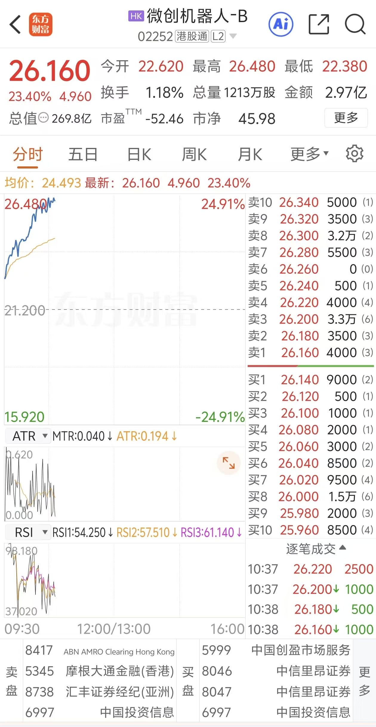 消息面上,微创机器人-B近期公告,集团旗下腔镜、骨科、血管介入核心产品的综合订单量累计突破230台。其中,核心产品图迈腔镜手术机器人(简称"图 迈")在全球范围内的商业化订单累计超过160台,含今年新获订单近120台。上述综合订单中,集团旗下各产品共完成商业化装机150余台。 此外,微创机器人-B还公告,集团自主研发的支气管镜手术机器人独道®UniPathTM电子支气管镜手术导航系统(简称"独道")正式获得国家药品监督管理 局批准。这是集团引领全球手术机器人领域技术与应用发展的里程碑式突破,也标志着国产手术机器人在微无创诊疗关键技术路径上实现系统性全覆盖。 来源:上海证券报·中国证券网 上证报中国证券网讯(记者 孔令仪)12月29日早盘,微创机器人-B一度涨超24%,最高报26.48港元/股。截至10时38分,微创机器人-B涨23.40%,报26.16港 元/股。 | | | | | ZO.UOU | | --- | --- | --- | --- | --- | | | | | न्नेंटर | 26.040 | | | | | 买7 | 26.020 | | | | | 录8 | 26.000 | | ...
