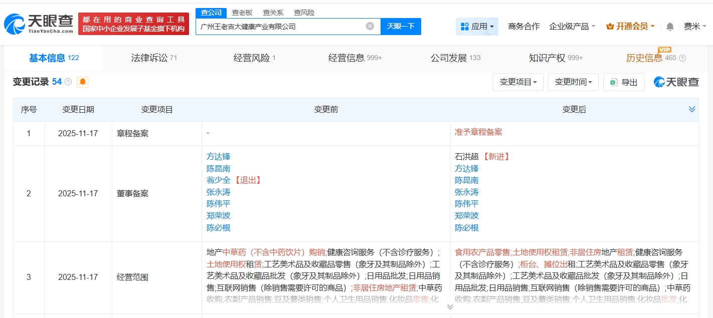 每经AI快讯,天眼查工商信息显示,近日,王老吉关联公司广州王老吉大健康产业有限公司发生工商变更,注册资本由9亿元人民币增至10亿元人民币,增 幅约11%,同时发生高管变更。广州王老吉大健康产业有限公司成立于2012年2月,法定代表人为陈昆南,经营范围包括食用农产品零售、土地使用权租 赁、非居住房地产租赁等。股东信息显示,该公司由白云山(600332)(600332)全资持股。 | 大限台 | 都在用的商业查询工具 | | 查公司 查老板 查关系 查风险 | | | --- | --- | --- | --- | --- | | | 国家中小企业发展子基金旗下机构 | | × 天眼一下 广州王老吉大健康产业有限公司 | 船 应用 ▼ 商务合作 · | | 基本信息 122 | | 法律诉讼 71 | 经营风险 1 经营信息 999+ | 公司发展 133 知识 | | 变更记录 54 ○ ● | | | | 变更项目 - | | 序号 变更日期 | | 变更项目 | 变更前 | | | 1 2025-11-17 | | 章程备案 | 方达锋 | 准予章程备案 石洪超 【新讲】 | | | | | 陈昆南 翁少全 ...