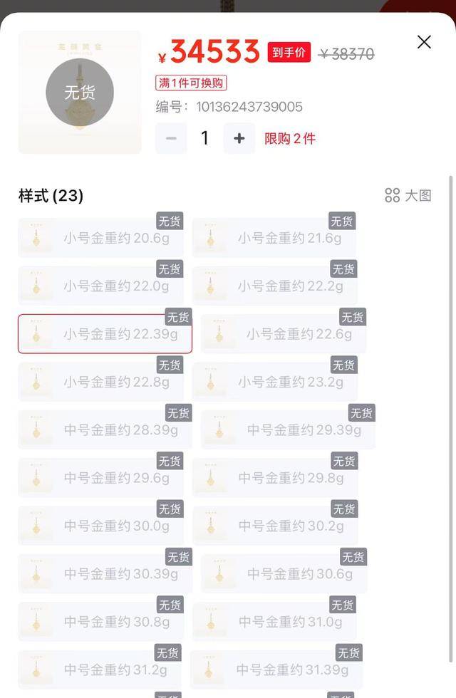 10月26日,老铺黄金此前宣布的年内第三次调价正式兑现。相较今年8月时产品5%—13%的涨幅,本次老铺黄金多款产品涨幅超20%,加价力度不小。 据蓝鲸新闻,记者查询发现,十字金刚杵1号(8.39克)调价后18500元,较此前价差3500元,涨幅为23.33%;玫瑰花窗1号宝石款(14.8克)调价后30610 元,较此前价差6150元,涨幅为25.15%;点钻葫芦(7.39克)调价后16750元,较此前价差2660元,涨幅为18.87%;太阳图腾(8克)调价后19500元,较 此前价差3110元,涨幅为18.97%。 此前,老铺黄金曾发布调价预告称,将于10月26日进行产品价格调整。产品调价详情,以线上线下门店实际标价为准。 这是老铺黄金今年以来进行的第三次调价,前两次分别是在2月和8月。据了解,老铺黄金每年会进行2—3次价格调整,也符合其调价策略。而且老铺黄金 走的是"黄金奢侈品"路线,类似于周大福对"一口价"黄金产品进行调价。 10月24日深夜,上海,顾客在恒隆广场外面排队等候。图源:智通财经 10月24日晚11点30分,智通财经记者在恒隆广场现场看到,商场门口等候的队伍蜿蜒曲折,约有两三百人。他们在民警和 ...