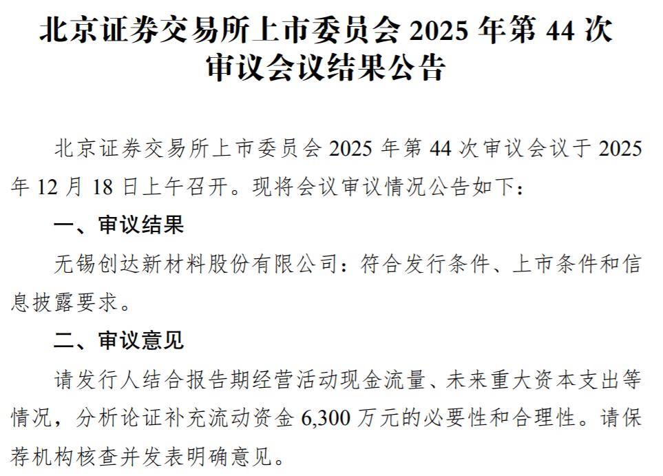 | 审议会议日期 公司简称 注册地 | | | 拟融资 | 2024年/2025年1-6月 | 2024年/2025年1-6月 拟上市 | | 审议结果 | 中介机构 | | --- | --- | --- | --- | --- | --- | --- | --- | --- | | | | | (亿元) | 营业收入(亿元) | 净利润(亿元) | 板块 | | | | 2025年12月18日 | 创达 | 江苏 | 3 | 4.19/2.11 | 0.61 /0.33 | 北交 | 通过 | 申万宏源 立信 | | 新材 | | | | | | 所 | | | | | | | | | | | | 国浩 | | | | | | | | | | 制表:财汇安投 | 创达新材本次北交所IPO保荐机构、会计师事务所、律师事务所分别为申万宏源证券承销保荐有限责任公司、立信会计师事务所(特殊普通合伙)和国浩 律师(上海)事务所。 创达新材2003年成立,主营业务为高性能热固性复合材料的研发、生产和销售,目前 主要产品包括环氧模塑料、液态环氧封装料、有机硅胶、酚醛模塑 料和导电银胶等电子封装材料。 2022年度、20 ...