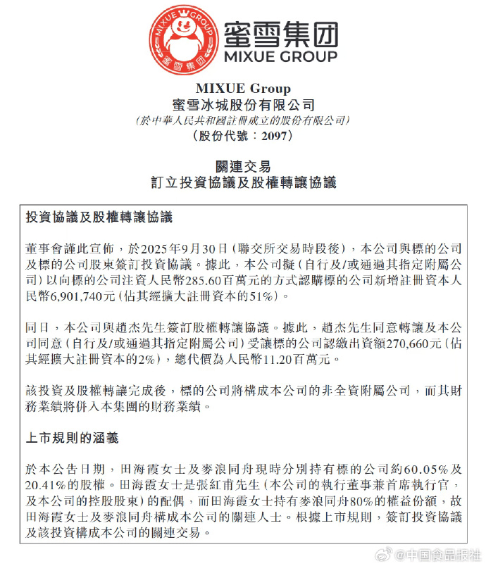 据此,蜜雪集团拟(自行及/或通过其指定附属公司)以向福鹿家注资人民币2.86亿元的方式认购标的公司新增注册资本人民币690.17万元(占其经扩大注 册资本的51%)。同日,蜜雪集团还与赵杰签订股权转让协议,据此,赵杰同意转让及蜜雪集团同意受让福鹿家认缴出资额27.06万元(占其经扩大注册 资本的2%),总代价为人民币1120万元。 由此,蜜雪集团将合计斥资2.97亿元,取得福鹿家53%的股权。待上述投资及股权转让完成后,福鹿家将成为蜜雪集团的非全资附属公司,而其财务业绩 将并入蜜雪集团的财务业绩。 10月1日,蜜雪集团发布公告称,9月30日联交所交易时段后,蜜雪集团已与标的公司及标的公司股东签订投资协议,此次标的公司为福鹿家(郑州)企业 管理有限公司(以下简称"福鹿家")。 10月2日,"蜜雪冰城要卖啤酒了"话题冲上热搜,引发广泛关注。同日,据极目新闻,记者从一位接近蜜雪冰城的人士处了解到,此消息属实。 据了解,蜜雪冰城是以新鲜冰淇淋茶饮为主的全国知名饮品连锁品牌。截至2025年6月,蜜雪集团全球门店超过53000家,拥有蜜雪冰城、幸运咖两大品 牌,提供单价约6元的现制果饮、茶饮、冰淇淋和咖啡等产品。 鲜啤福 ...