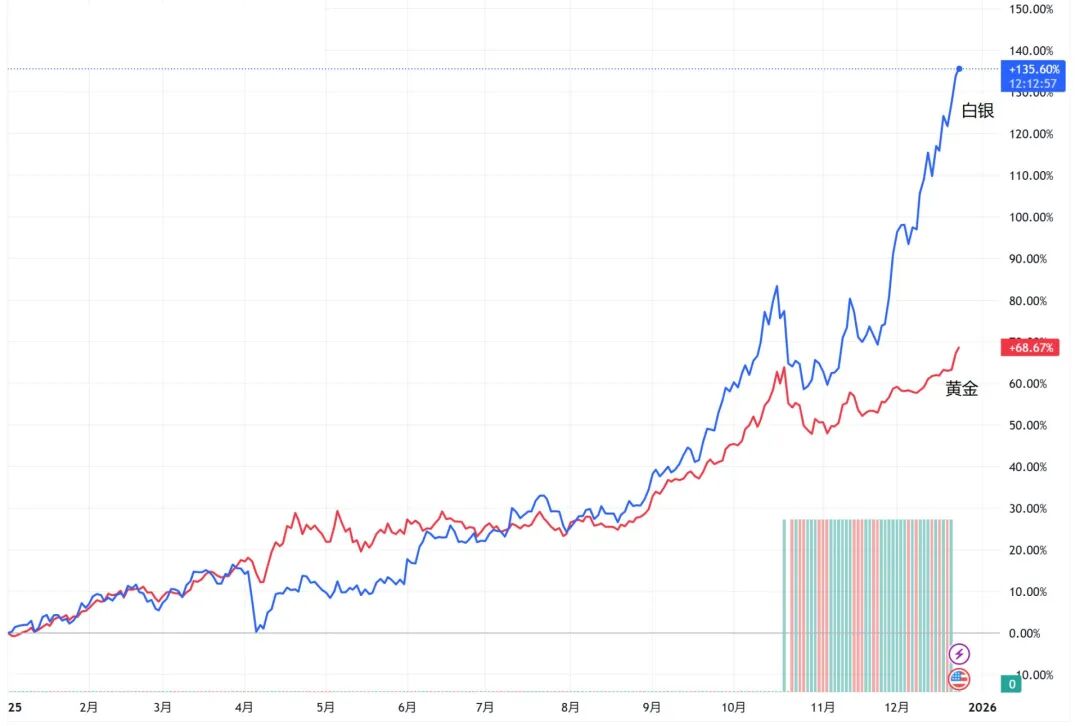 12月23日,现货白银价格一度突破70美元/盎司,创下历史新高,而国际油价则在低位徘徊,WTI原油现报58.07美元/桶。"银比油贵"现象时隔45年再度上 演。 同日,现货黄金一度突破4497美元/盎司,同样刷新历史纪录,年内累计涨超70%;而白银年内涨超140%,涨幅是黄金的两倍。 中国社会科学院世界经济与政治研究所国际大宗商品研究室主任王永中向《每日经济新闻》记者(以下称每经记者)分析指出,白银与黄金同属贵金属, 黄金价格先行上涨后,过去几年涨幅相对滞后的白银因估值偏低,存在自然的"补涨需求"。 他认为,与上次出现"银比油贵"不同的是,当前处于能源转型与数字经济阶段,白银的工业应用场景更丰富,需求逻辑更稳固。据统计,2016年~2024年 八年间,白银工业需求增长约5000吨。 白银突破70美元创历史新高 年内涨幅140%碾压黄金 12月23日,大宗商品市场迎来历史性时刻,国际现货白银价格强势上攻,盘中一度突破70美元/盎司大关,刷新历史纪录。同日,现货黄金也一度突破 4497美元/盎司,创下新高。 回顾全年,贵金属无疑是资产配置中最耀眼的明星。截至12月23日,现货黄金年内累计涨70.89%,而现货白银 ...
