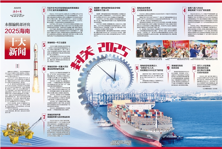 海南自由贸易港全岛封关启动 - 2025年12月18日,海南自由贸易港正式启动全岛封关,成为中国对外开放的标志性举措[15] - 全岛封关涉及8个对外开放口岸及10个“二线口岸”监管设施启用,标志着海南岛成为海关监管特殊区域,开启“一线放开、二线管住、岛内自由”新篇章[15] 高层战略部署与规划 - 2025年11月6日,习近平总书记在三亚听取海南自由贸易港建设工作汇报并发表重要讲话,强调要全面实现海南自由贸易港建设目标[13] - 2025年11月29日至30日,海南省委八届八次全会召开,审议通过关于高标准建设自贸港的决定和“十五五”规划建议,为未来发展擘画蓝图[16] 重大项目建设进展 - “深海一号”大气田二期项目于2025年6月25日全面投产,标志着中国最大海上气田建成[18] - 环海南岛海上气田群2025年累计生产油气突破千万吨油当量,创产量新高[18] - 全球首个陆上商用模块式小型堆“玲龙一号”于2025年10月16日完成一回路冷态功能试验[18] - 全国首个500千伏省域数字电网——海南500千伏主网架工程于2025年12月15日投产,使海南电网核心主网架电力输送能力提升超4倍[18] - 海南省首条双向八车道高速公路——洋浦疏港高速公路于2025年12月30日正式通车[19] 产业与外资引进 - 2025年12月18日,西门子能源在华首个燃机总装基地及服务中心落户洋浦,成为海南全岛封关后落地的首个制造业标志性外资项目[18] - 海南商业航天发射场一号发射工位于2025年3月12日首次发射成功,实现“一箭十八星”,标志着该发射场具备双工位发射能力[17] - 该商业航天发射场从动工到双工位投用仅用32个月,刷新建设速度,截至2025年已实现十次发射全部成功[17] 航空与交通开放 - 2025年12月21日,中国首条第七航权客运航线“三亚⇌布拉格”开通,由哈萨克斯坦斯卡特航空执飞[21] - 该航线的开通有助于提升海南国际航空枢纽地位,标志着海南在航空领域的高水平对外开放迈出关键一步[21] 旅游业发展 - 2025年,海南预计接待国内外游客1.06亿人次,同比增长9%[22] - 2025年,海南游客总花费预计达2249.84亿元,同比增长10.3%,标志着旅游业迈入“旅客超1亿人次、总花费超2000亿元”新阶段[22][23] 离岛免税政策升级 - 海南离岛免税新政于2025年11月1日起正式实施[24] - 新政允许岛内居民一年内一次离岛可不限次数购买“即购即提”商品,并将享惠对象扩大到离境旅客[24] - 新政新增宠物用品、可随身携带的乐器2个商品大类,使免税商品品类提高至47个大类,并允许陶瓷制品、茶等6类国内商品进入离岛免税店销售[24] 人才引进与计划 - 自2018年“百万人才进海南”行动计划实施至2025年11月底,海南共引进各类人才103万,提前完成目标[25] - 2025年12月6日,第二届中国(海南)人才交流大会宣布启动“百万英才兴海南”行动计划,目标在未来5年再为海南新增100万名人才[25] 军事与国防 - 中国第一艘电磁弹射型航空母舰福建舰于2025年11月5日在海南三亚某军港入列[14] - 福建舰是中国第三艘航空母舰,舷号为“18”,采用中国完全自主设计建造的电磁弹射技术,处于世界先进水平[14]