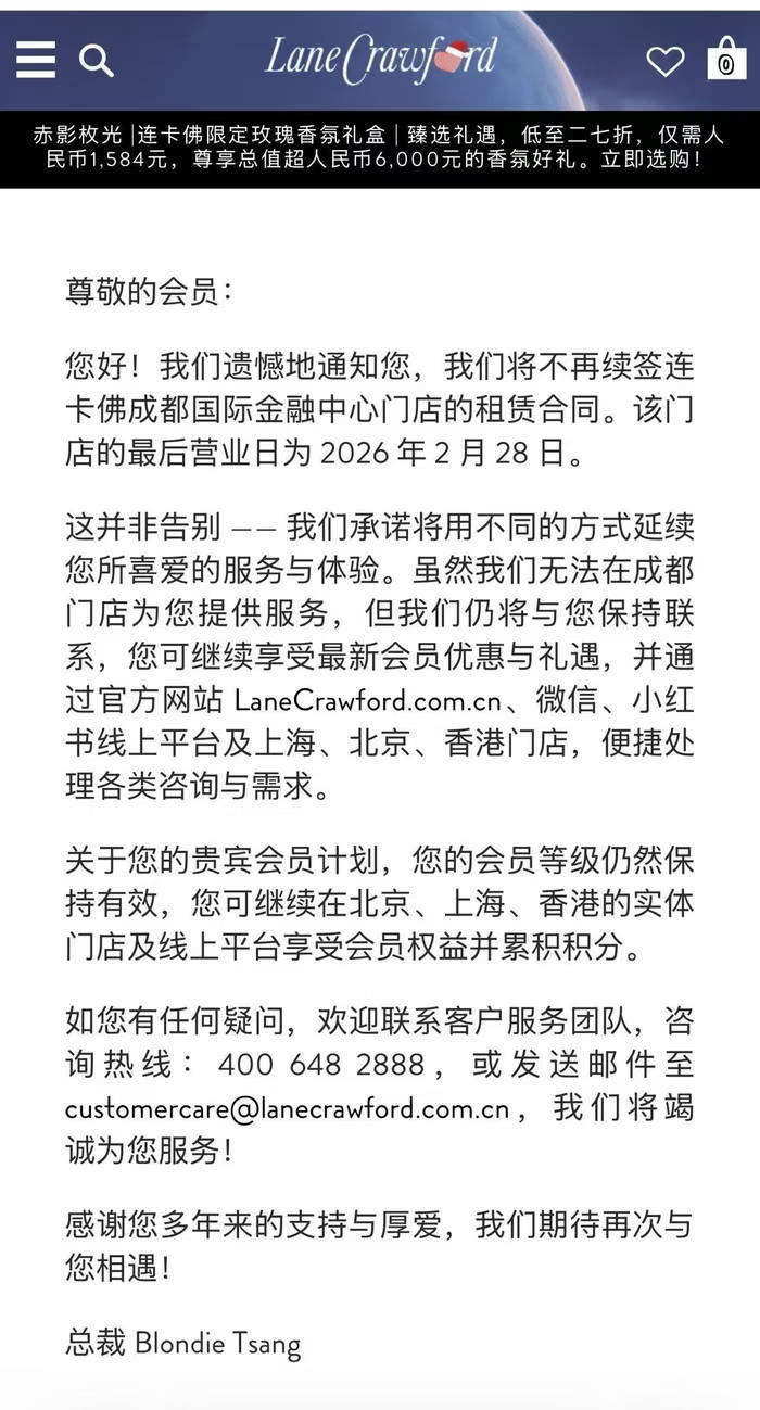 中国商报(记者 于佳鑫)成立于1850年的香港高端买手店品牌连卡佛(Lane Crawford),近日宣布将在明年2月底关闭其位于成都国际金融中心的门店—— 这是继2021年关闭北京银泰中心店后,连卡佛在中国内地市场关闭的第二家精品店。 从收缩线下业务,到尝试发展线上渠道,这家拥有175年历史的老牌买手店后续将如何调整? 成都门店确认将不再续约 12月9日,连卡佛通过短信、邮件、官网通知等形式确认,其将不再续签成都国际金融中心门店,该门店最后营业日为2026年2月28日。 连卡佛在通知中称,虽然其无法在成都门店继续提供服务,但仍将与消费者保持联系,消费者可继续享受最新会员优惠与礼遇,并通过官网、微信、小红书 线上平台及上海、北京、香港门店处理各类咨询与需求。 连卡佛称,成都国际金融中心门店营业结束后,消费者的会员等级仍然保持有效,可继续在北京、上海、香港的实体门店及线上平台享受会员权益并累积积 分。此外,针对会员账户中尚有未兑换的积分回馈礼品卡的成都门店消费者,连卡佛也提醒,应在2026年2月28日前前往该门店完成兑换。 主打"买手制"经营模式 连卡佛不仅是历史悠久的精品百货品牌,更以其在高端零售领域大规模、 ...