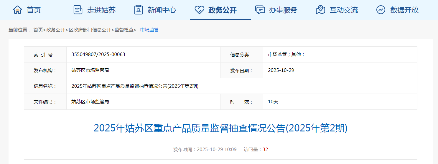 江苏省苏州市姑苏区市场监管局发布2025年第2期重点产品质量监督抽查情况