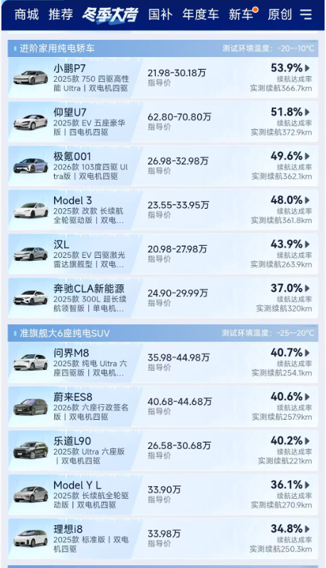 2025年度汽车之家冬季测试核心结果 - 汽车之家在内蒙古牙克石进行了规模最大的一次冬季测试,测试环境温度为-10℃至-25℃,围绕续航达成率、能耗、快充、空调、自动紧急制动、加速、越野能力七大场景展开考评 [1] - 测试覆盖各价位段车型,包括小型两厢车、轿车及SUV,被视为纯电车型的“续航考场” [1] 纯电车型冬季续航达成率排名 - **进阶家用纯电轿车**:小鹏P7四驱版以53.9%的续航达成率位居榜首,实测续航366.7公里 [1][2] - **进阶家用纯电轿车**:比亚迪仰望U7四驱版以51.8%的续航达成率位列第二,实测续航372.9公里 [1][2] - **进阶家用纯电轿车**:极氪001四驱版以49.6%的续航达成率排名第三,实测续航362.1公里 [1][2] - **进阶家用纯电轿车**:特斯拉Model 3长续航全轮驱动版续航达成率为48.0%,实测续航361.8公里 [2] - **进阶家用5座纯电SUV**:整体续航达成率不如进阶家用纯电轿车,例如特斯拉Model Y四驱版的续航达成率为35.2% [1] - **准旗舰大6座纯电SUV**:问界M8纯电版续航达成率为40.7%,实测续航254.1公里 [1][2] - **准旗舰大6座纯电SUV**:蔚来ES8续航达成率为40.6%,实测续航257.9公里 [1][2] - **准旗舰大6座纯电SUV**:乐道L90续航达成率为40.2%,实测续航221公里 [2] - **准旗舰大6座纯电SUV**:特斯拉Model Y L长续航全轮驱动版续航达成率为36.1%,实测续航270.9公里 [2] - **准旗舰大6座纯电SUV**:理想i8四驱版以34.8%的续航达成率成为该项目得分最低的车型,实测续航250.3公里 [1][2] 理想i8的市场表现与行业背景 - 理想i8是理想汽车的首款纯电SUV,于2025年7月上市,定位六座纯电中大型SUV [3] - 理想i8交付量远低于市场预期,仅相当于同期竞品乐道L90的近一半左右,拖累了理想汽车的销量曲线 [3] - 行业数据显示,新能源车在低温下续航普遍衰减,未配备专项防寒技术的车辆在零下10℃环境下续航衰减30%-40%,在零下20℃极寒环境下衰减率可达50%以上 [3] 小米汽车的相关动态 - 小米汽车SU7未出现在本次冬季测试榜单中,业内人士认为原因大概率是未参加测试 [5] - 小米创始人雷军回应网友发帖时表示,相信小米SU7的冬季续航是纯电车中最好的之一 [5] - 目前市场可通过小米SU7与特斯拉Model Y的表现进行间接对比,但无法准确判断SU7与Model 3之间的实际差距 [5]