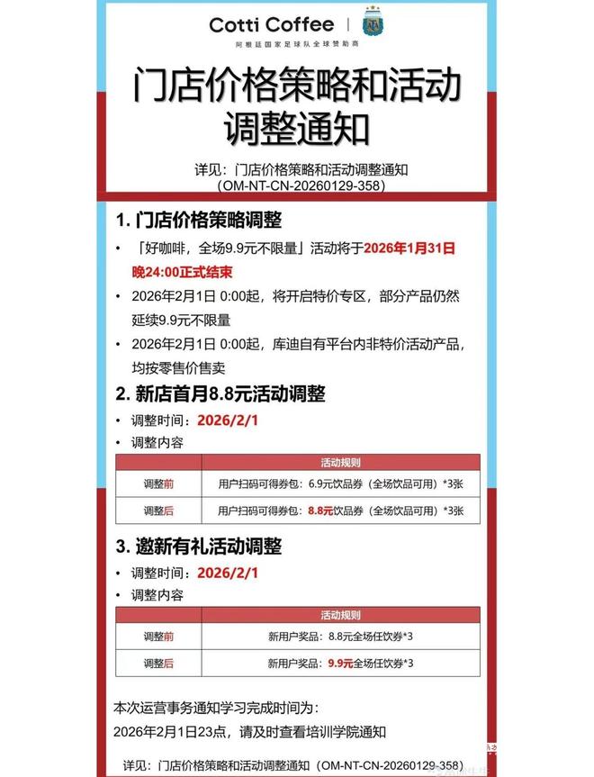 公司核心价格策略调整 - 库迪咖啡将于1月31日晚24:00正式结束“全场9.9元不限量”活动 [1] - 自2月1日起,公司将开启特价专区,仅部分产品延续9.9元不限量,非特价产品均按零售价售卖 [1] - 公司新店首月活动自2月1日起调整,用户扫码获得的饮品券从3张6.9元券调整为3张8.8元券 [1] 公司官方确认与现状 - 公司相关负责人确认将缩小9.9元活动的覆盖范围,部分产品延续特价,全线产品持续参与外卖平台补贴活动 [6] - 调价通知已于1月29日由总部向加盟商发布,1月30日多家门店仍有全场9.9元活动 [3] - 根据点餐小程序,公司饮品零售价在10.5元至15.9元之间,活动调整后整体价格将明显上调 [6] 公司过往促销策略与财务表现 - 公司于2023年2月率先在行业发起所有产品9.9元的促销活动,并多次延续 [8] - 2024年5月及7月,公司首席策略官表示已为9.9元促销活动做好延续3年的资金准备,策略“至少要持续三年” [8] - 2024年6月,公司相关负责人确认9.9元活动预期三年,可能更久,视市场培育情况而定 [8] - 2025年2月,公司透露自2024年5月开始至2025年2月已实现正向现金流,即盈利 [8] 行业竞争与价格战演变 - 2023年4月,在库迪发起活动后,瑞幸咖啡宣布每周推出9.9元咖啡单品,参与活动门店有上千家 [9] - 2023年8月,瑞幸宣布9.9元活动将常态化进行,至少持续两年,价格战随后蔓延至Tims天好咖啡、奈雪、沪上阿姨等现制饮品品牌 [9] - 2024年2月,瑞幸调整了9.9元活动覆盖范围,参与饮品明显减少,调整后其2024年第三季度和第四季度营业利润率有所改善 [9] - 目前以广州门店为例,瑞幸仅有不到10款饮品参与9.9元促销活动 [9] 公司扩张进展 - 公司于2022年10月在福建福州开出首家门店,创始团队为瑞幸创始人陆正耀及前CEO钱治亚 [9] - 公司通过联营模式扩张迅猛,截至2025年12月22日,全国门店数超过1.8万家 [9] - 公司未达成原定开店目标,其原本计划是在2025年底将门店数增至5万家 [9]