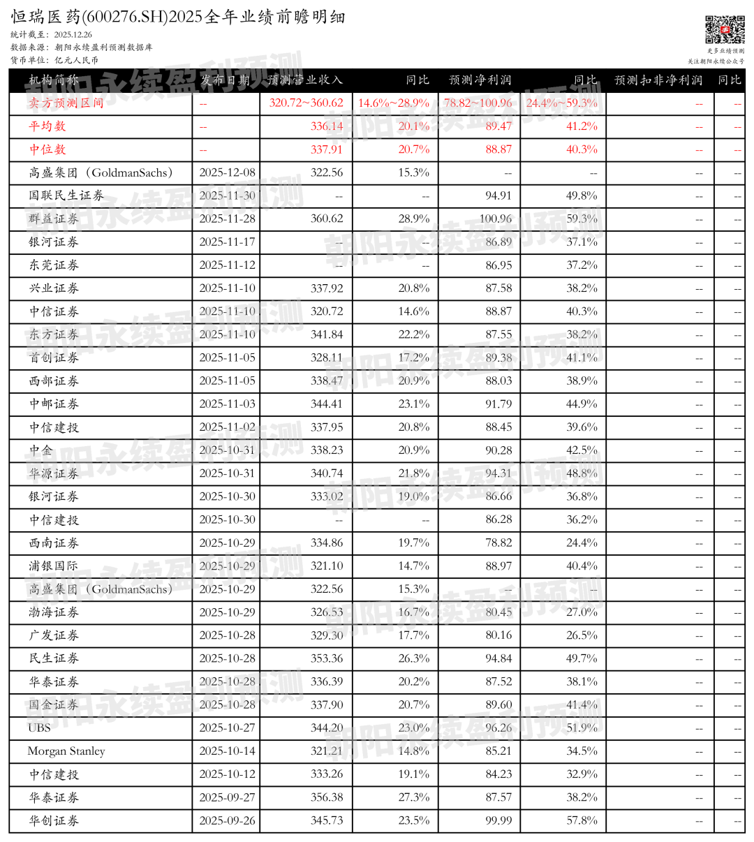 预测公司Q4一致预期营业收入320.72~360.62亿元,同比增长14.6%~28.9%; 预测公司Q4一致预期净利润78.82~100.96亿元,同比增长24.4%~59.3%。 关注后续财报数据披露后能否超预期,朝阳永续A股季度业绩前瞻数据将为投资者提供业绩鉴定。 1. 最近拟披露财报发布日 恒瑞医药(600276.SH)将于2026年3月26日公布2025年年报。 2. 恒瑞医药全年业绩预期怎么样? 截至2025年12月26日,根据朝阳永续季度业绩前瞻数据: | 货币单位:亿元人民币 | | | | | | 关注朝阳永续公众号 | | | --- | --- | --- | --- | --- | --- | --- | --- | | 机构简称 | | 预测营业收入 | 同比 | 预测净利润 | 同比 | 预测扣非净利润 | 同比 | | 卖方预测区间 | | 320.72~360.62 | 14.6%~28.9% | 78.82~100.96 | 24.4%~59.3% | - | - | | 平均数 | -- | 336.14 | 20.1% | 89.47 | 41.2% | -- | - | ...