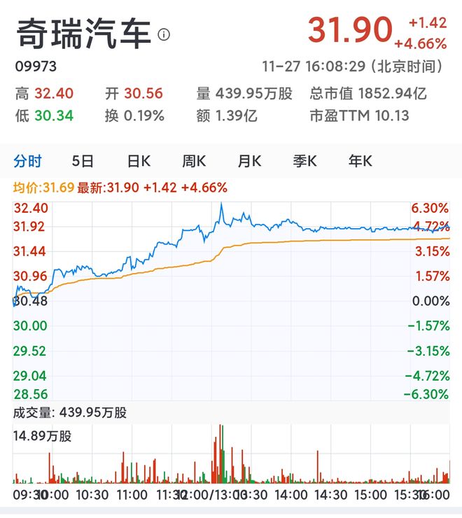 奇瑞汽车股价大涨近5%,券商看好“量利齐增”前景,给予“买入”评级