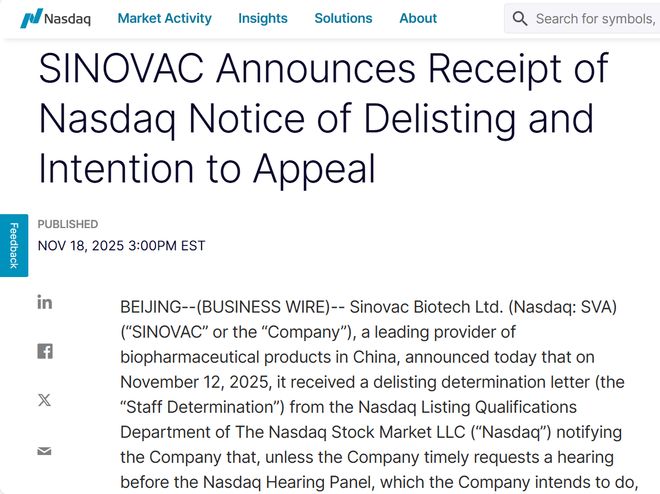 科兴生物收到纳斯达克退市决定函,拟申请听证暂缓程序