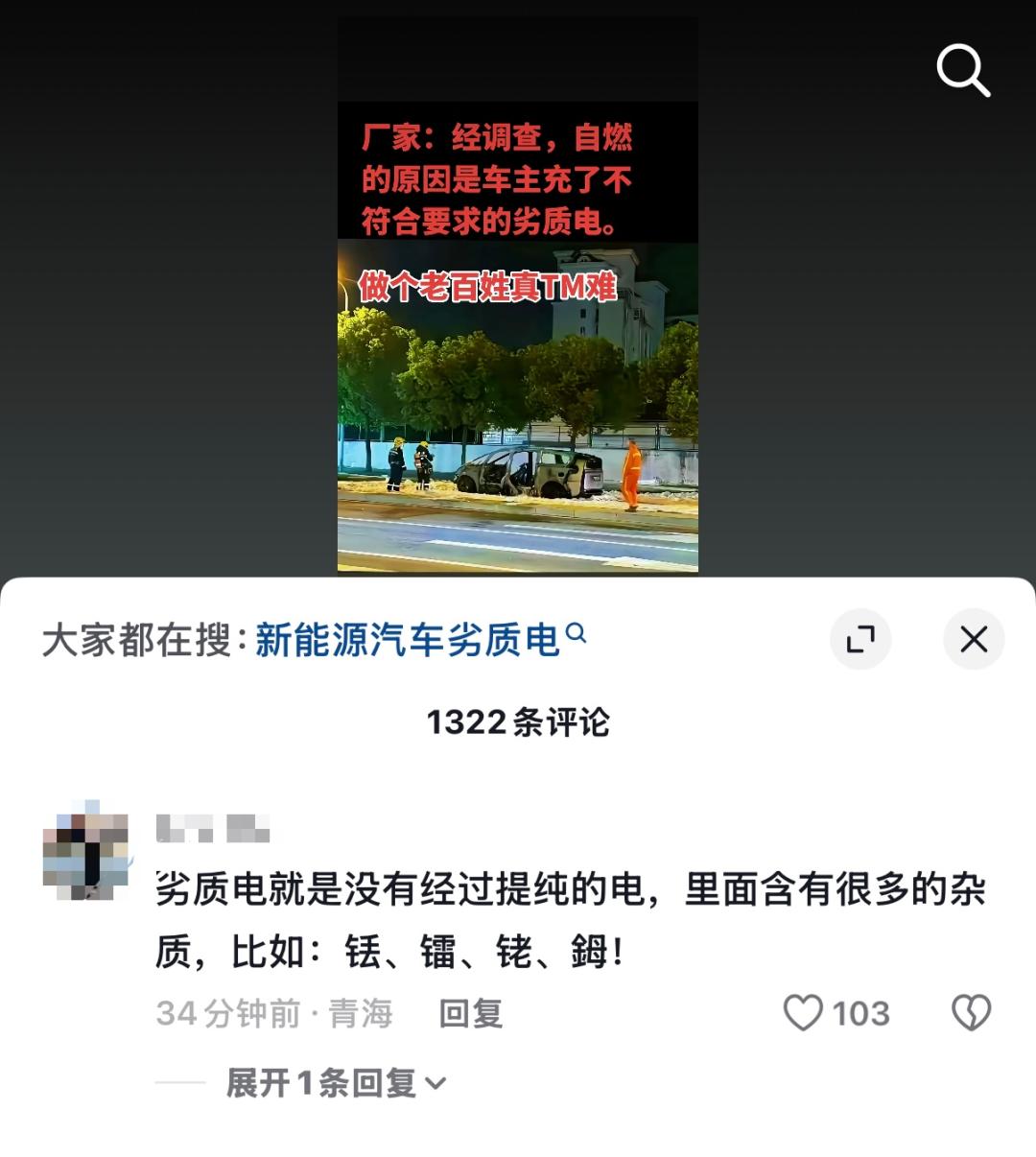 近日,上海一辆新能源车无故起火事件引发关注,网上在好奇起火原因的同时,也流传出车辆起火是因为充了"劣质电"的说法。 电压高低区分"优劣质电","水核风火电都不行" 关于"劣质电"这种说法,笔者还是第一次听说,起初只是以为网友们在"玩儿梗恶搞",但看了几条视频后,发现会有人相信"劣质电"的存在,并且还有人 专门介绍了"劣质电"的概念。 更有视频称,"劣质电指的是电压不稳,杂质多或来源不正规的电力,就是从不正规的电网渠道输送的电力。" 该视频还称,"长时间充这种劣质电会引发火灾、设备损坏等严重危害,并且这种电一般价格要远低于普通充电站。" 针对"劣质电"的说法,还有网友开始"玩儿梗"。 有网友称,"劣质电就是没有经过提纯的电,里面的杂质很多,比如铥、镭、铑、鉧。" 也网友"科普",电有"优质电"与"劣质电"之分。 "优质电"的电压为220V;电力频率为50HZ;波形畸变为正弦波。而电压小于192V,大于242V;电力频率偏离50正负0.2HZ;波形畸变出现大量斜波,则 属于"劣质电"。 有网友戏称,"劣质电就是冲了雷公打的电。" 还有网友调侃,"光伏电,不能用,沙子多! 水电,不能用,水草多! 核电,不能用,废水 ...