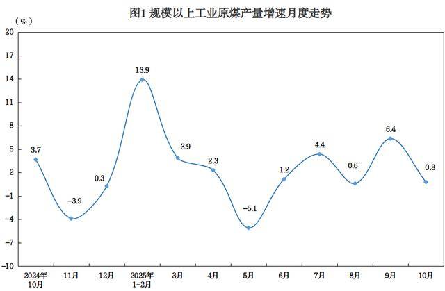 文章核心观点 - 2025年10月份规模以上工业能源生产总体呈现原煤产量高位、原油天然气稳步增长、电力生产显著提速的态势 [2] - 1至10月累计数据显示主要能源产品生产保持增长,电力生产结构出现分化,火电由降转增,风电下降明显 [10] 原煤生产及相关情况 - 10月份规上工业原煤产量4.1亿吨,同比下降2.3%,日均产量1312万吨 [2] - 1~10月份规上工业原煤产量39.7亿吨,同比增长1.5% [2] 原油生产及相关情况 - 10月份规上工业原油产量1800万吨,同比增长1.3%,增速较9月份放缓2.8个百分点,日均产量58.1万吨 [4] - 1~10月份规上工业原油产量18064万吨,同比增长1.7% [4] - 10月份规上工业原油加工量6343万吨,同比增长6.4%,日均加工204.6万吨 [4] - 1~10月份规上工业原油加工量61424万吨,同比增长4.0% [4] 天然气生产情况 - 10月份规上工业天然气产量221亿立方米,同比增长5.9%,增速较9月份放缓3.5个百分点,日均产量7.1亿立方米 [7] - 1~10月份规上工业天然气产量2170亿立方米,同比增长6.3% [8] 电力生产总体情况 - 10月份规上工业发电量8002亿千瓦时,同比增长7.9%,增速较9月份加快6.4个百分点,日均发电258.1亿千瓦时 [10] - 1~10月份规上工业发电量80625亿千瓦时,同比增长2.3% [10] 电力生产分品种情况 - 10月份规上工业火电同比增长7.3%,9月份为下降5.4% [10] - 10月份规上工业水电增长28.2%,增速较9月份放缓3.7个百分点 [10] - 10月份规上工业核电增长4.2%,增速较9月份加快2.6个百分点 [10] - 10月份规上工业风电下降11.9%,降幅较9月份扩大4.3个百分点 [10] - 10月份规上工业太阳能发电增长5.9%,增速较9月份放缓15.2个百分点 [10]