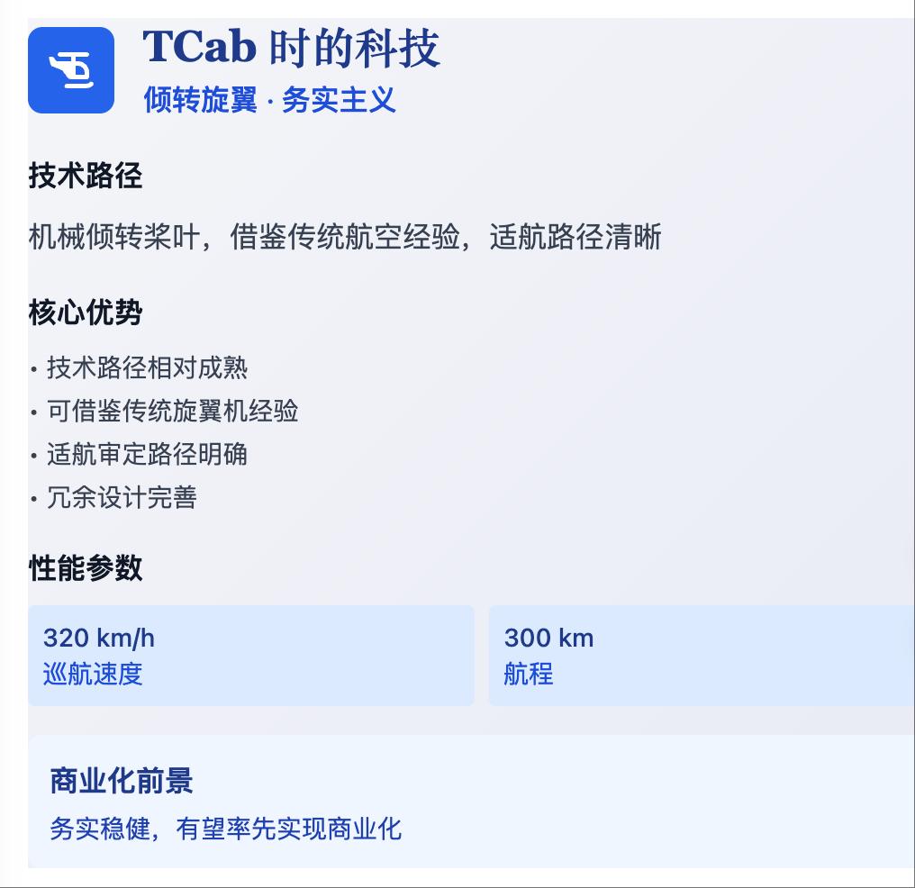 2025 年的中国低空赛道,热得像一场不眠的风暴。 在航展、城市示范区、媒体镜头里,电动垂直起降飞行器(eVTOL)正一次次以"首飞"、"签约"、"交付"刷屏。 但在闪光灯之外,这个行业开始出现温差:资本收紧、适航审查趋严、地方项目停滞,叙事的热度正被现实的冷气包围。 在这片仍未形成气候的天空里,有三家公司格外引人注目—— 时的科技(TCab Tech)、天翎科(INFLYNC)、沃兰特(Volant)。 作为行业中倾转构型技术路线的重要代表企业。 三家都押注"倾转"架构——即同时兼具垂直起降与固定翼巡航的中速或高速飞行方案。 三家都宣称自己代表"未来城市空中交通的主流方向"。 三家都拥有实验样机、政府签约、以及不同程度的融资记录。 但问题是—— 当热度褪去,谁真的能飞得久? 谁的速度是真实的进度,而不是宣传片里的速度? 一 速度的幻觉:首飞之后,故事才刚开始 在低空经济这场军备竞赛里,"首飞"被过度神化。 TCab 时的科技 y 倾转旋翼 · 务实主义 机械倾转桨叶,借鉴传统航空经验,适航路径清晰 核心优势 性能参数 320 km/h 巡航速度 300 km 航程 商业化前景 务实稳健,有望率先实现商业化 ...