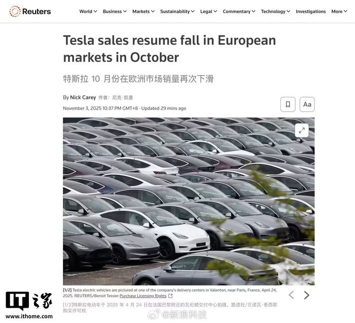 【#特斯拉在欧洲多地销量下滑#】据路透社报道,特斯拉在 10 月的销量在多个欧洲国家出现了显著下 降,西班牙、荷兰和北欧市场的销量下滑,进一步凸显其在欧洲市场的困难持续存在。 特斯拉在瑞典的销量仅为 133 辆,落后于保时捷(172 辆)。截至 10 月,特斯拉在瑞典的销量同比下 降了 67%。 研究公司 New AutoMotive 的研究经理西亚拉・库克指出,9 月之前,欧盟市场的主流品牌如菲亚特、 沃尔沃、铃木和马自达的销量下降了 15% 至 18%,他们正在更新车型以适应消费者需求。 然而,特斯拉在欧盟的销量下降了近 39%。西亚拉・库克表示:"马斯克因素似乎在销量差异中扮演了 重要角色。"(IT之家) Reuters World V Business V Markets V Sustainability V Legal V Commentary V Technology V Investigations More V Tesla sales resume fall in European markets in October 截至今年 9 月,特斯拉在欧洲的销量同比下降了 28.5%。此外,特斯拉还 ...