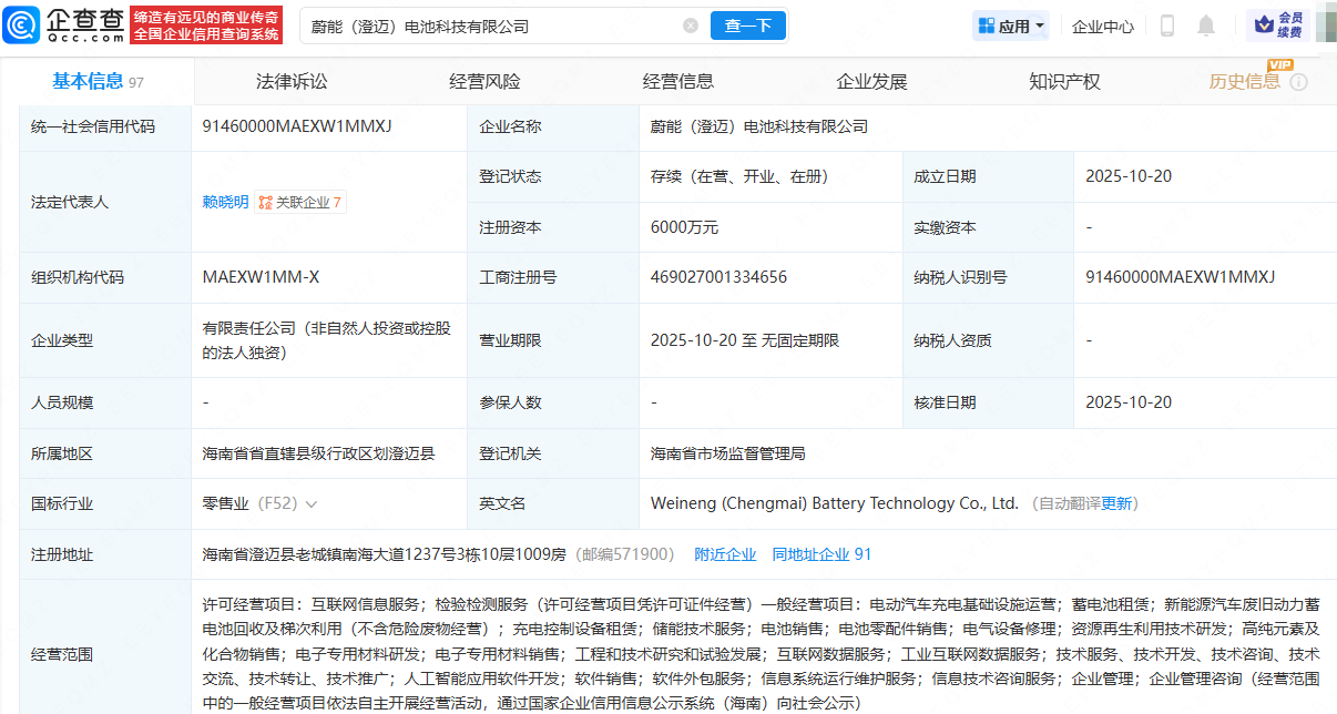 蔚能电池在海南成立电池科技公司,注册资本6000万