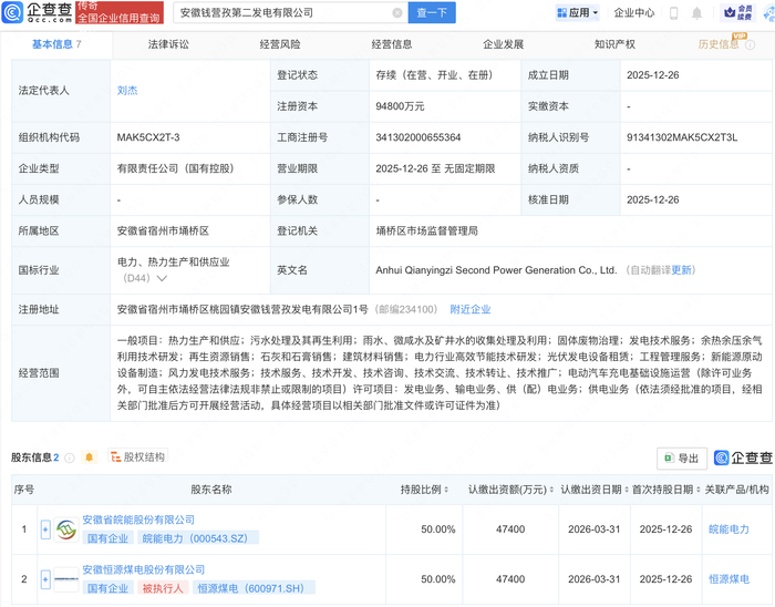 | | | 安徽钱营孜第二发电有限公司 | 0 道一下 | | 設应用 ▼ | 企业中心 11.40 | | | --- | --- | --- | --- | --- | --- | --- | --- | | 基本信息 7 | 法律诉讼 | 经营风险 | 经营信息 | 企业发展 | 知识产权 | | 历史信息 | | 法定代表人 | 刘签 | 登记状态 | 存续(在营、开业、在册) | | 成立日期 | 2025-12-26 | | | | | 注册资本 | 94800万元 | | 实缴资本 | | | | 组织机构代码 | MAK5CX2T-3 | 工商注册号 | 341302000655364 | | 纳税人识别号 | 91341302MAK5CX2T3L | | | 企业类型 | 有限责任公司(国有控股) | 营业期限 | 2025-12-26 至 无固定期限 | | 纳税人资质 | | | | 人员规模 | | 参保人数 | | | 核准日期 | 2025-12-26 | | | 所属地区 | 安徽省宿州市埔桥区 | 登记机关 | 埔桥区市场监督管理局 | | | | | | 国标行业 | 电力、 ...