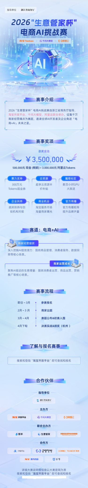 文章核心观点 - 淘宝联合生态伙伴举办“生意管家杯”电商AI挑战赛,旨在通过“商家出题、开发者解题”的模式,征集并孵化优秀的电商AI解决方案,以推动“电商+AI”的工具进化、生态共赢与商业新生 [1][4][5] 赛事概况与目标 - 赛事由浙江省商务厅指导,淘宝开放平台、千问大模型、阿里云、瓴羊联合举办,主题为“工具进化 生态共赢 商业新生” [1][3][4] - 大赛面向全国淘天电商人征集经营难题,并向全球AI开发者及优秀企业征集解决方案,采用“商家出题+线上报名+专家评审+线下实战”的流程 [4] - 大赛目标是探索AI与电商的融合,推动电商AI发展,帮助商家实现运营提效和经营增长 [4][5] 赛事赛道与核心场景 - 大赛分为“经营提效”和“商家经营增长”两个赛道 [3][4] - “经营提效”赛道聚焦商品管理、消费者服务、数据洞察等核心场景 [3][4] - “商家经营增长”赛道聚焦消费者运营、商品运营、营销推广等核心场景 [3][4] 赛事流程与安排 - 参赛报名期为即日起至3月 [3] - 商家出题期为2月至3月 [3] - 赛题公布及初赛入围期为3月至4月 [3] - 决赛实战及颁奖典礼将于4月下旬在阿里巴巴总部(杭州)举行 [3][4] 评审机制与标准 - 决赛将组建专家评审团,成员包括淘天、千问大模型、阿里云、生意管家、瓴羊的产品技术专家、行业运营专家和知名媒体人 [4] - 评审将聚焦AI产品的市场前景、技术能力、创新性和产品实战效果等维度 [4] 奖项与激励资源 - 赛事总奖金池为350万元,并提供价值千万的附加权益与资源扶持 [4][5] - 具体激励包括:阿里云百炼和瓴羊提供的300万元Tokens代金券、100-300小时魔搭社区免费GPU时长、阿里云折扣资源以及50万元的赛事奖金 [5] - 获奖AI产品可优先入驻淘宝服务市场,直面千万电商人 [5] - 主办方将为获奖者对接业内大咖、创投机构、政府和产业扶持资源 [5]