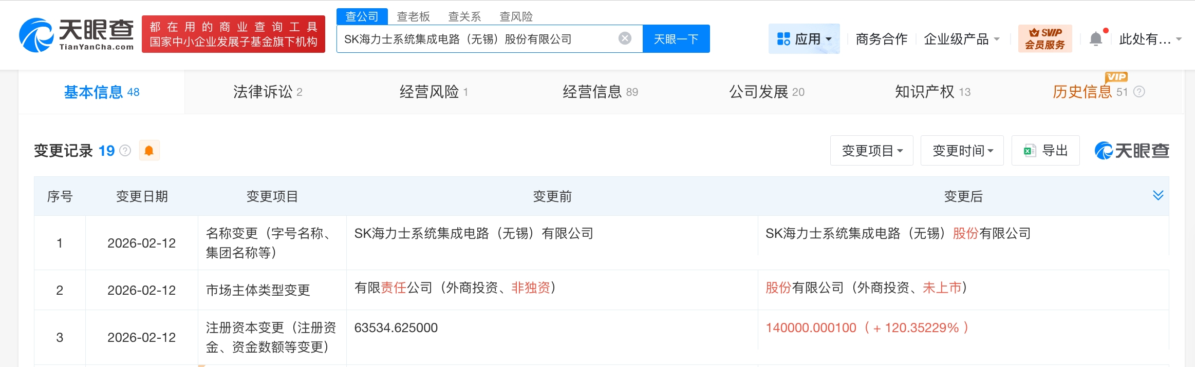 公司工商信息重大变更 - 公司名称由“SK海力士系统集成电路(无锡)有限公司”变更为“SK海力士系统集成电路(无锡)股份有限公司”,企业类型从“有限责任公司”变更为“股份有限公司”[1][2] - 公司注册资本由约6.35亿美元大幅增加至14亿美元,增幅约120%[1] - 公司成立于2018年8月28日,法定代表人为申熙泰(SHIN HEE TAE),营业期限至2074年10月14日[1][3] 公司股权结构与经营范围 - 公司股东包括SK hynix system ic Inc.、无锡产业发展集团有限公司、宁波高易三期创业投资合伙企业(有限合伙)及无锡高易海晟投资合伙企业(有限合伙)[1] - 公司经营范围涵盖生产、销售进出口集成电路、电子元件及上述产品零部件,并提供相关技术服务[1][3] - 公司为国标行业分类下的“信息处理和存储支持服务”企业,且为增值税一般纳税人[3] 公司运营与注册信息 - 公司注册地址位于江苏省无锡市新吴区至德大道702号,登记机关为无锡市市场监督管理局[3] - 根据2024年年报数据,公司参保人数为1536人,其分支机构参保人数为2人[3] - 公司英文名称为“SK Hynix System Integrated Circuit (Wuxi) Co., Ltd.”,统一社会信用代码为91320214MA1X3UR84L[3]