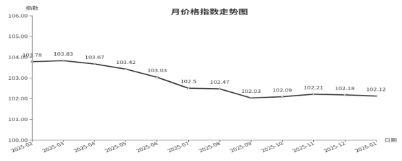 2026年1月临沂商城月价格总指数为102.12点,环比下跌0.06点
