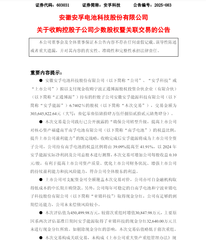 交易概述 - 公司拟以3.04亿元现金收购宁波正通博源持有的安孚能源6.7402%股权 [1] - 本次交易构成关联交易 但未构成重大资产重组 [4] - 交易完成后 安孚能源将成为公司全资子公司 [3] 战略目的与财务影响 - 交易旨在践行公司既定战略 即确保转型升级并提高对核心资产南孚电池的权益比例 [3] - 收购完成后 公司持有南孚电池的权益比例将由39.09%提高至41.91% [3] - 以2024年安孚能源实际净利润及公司总股本测算 本次交易可增加公司每股收益0.10元/股 [3] - 交易有利于提高上市公司资产质量 优化财务状况 增强持续盈利能力和抗风险能力 [3]