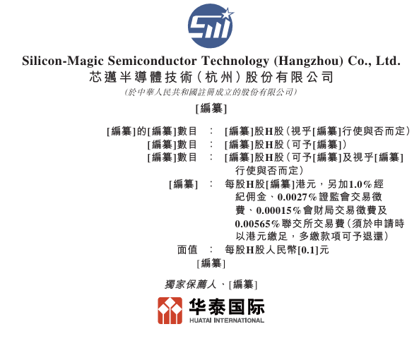 智通财经APP获悉,据港交所1月7目披露,芯迈半导体技术(杭州)股份有限公司(简称:芯迈半导体)向 港交所主板递交上市申请,华泰国际为其独家保荐人。该公司曾于2025年6月30目向港交所递交过上市 申请。招股书显示,芯迈半导体是一家功率半导体公司,通过自有工艺技术提供高效的电源管理解决方 案。公司的产品涵盖三大技术领域:移动技术、显示技术和功率器件,广泛应用于:汽车;电信设备; 数据中心:工业级应用:及消费电子产品。 芯 邁 半 導 體 技 術 ( 杭 州 ) 股 份 有 限 公 司 蜀家保薦人 · [編纂] Silicon-Magic Semiconductor Technology (Hangzhou) Co., Ltd. : [编纂]股H股(視乎[編纂]行使與否而定) [編纂]的[編纂]數目 「編纂]數目 :「編纂]股H股(可予[編纂]) [编纂]股H股(可予[編纂]及視乎[编纂] 「編纂]數目 行使與否而定) 每股H股[編纂]港元,另加1.0%經 [編纂] : 紀佣金、0.0027%證監會交易徵 費、0.00015% 會財局交易徵費及 0.00565%聯交所交易費(須於申請時 以港元繳足,多繳款項可予 ...