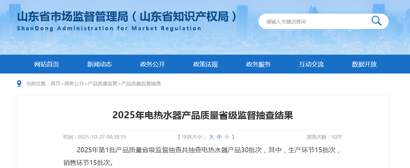 山东省市场监管局公布2025年电热水器产品质量省级监督抽查结果