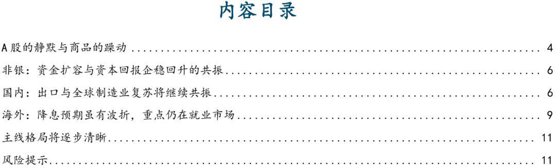 核心观点 报告认为,当前A股市场因缺乏明确宏观指引而交易清淡,但商品市场因长期低库存和新兴产业需求而表现强劲[3] 国内金融市场政策放松有望带来增量资金并与盈利回升形成共振[4] 同时,国内出口与全球制造业复苏趋势共振,外需修复信号明确[5] 海外方面,尽管美联储降息路径短期或有波折,但就业市场疲软决定了降息方向确定,这将推动全球制造业复苏和实物资产需求[6] 在此背景下,报告明确推荐工业资源品、非银金融、中国设备出口及制造业优势产业、以及受益于资本回流的消费板块作为主要投资主线[7] 1、A股的静默与商品的躁动 - 本周A股市场呈现缩量震荡,交易热度显著降温,全A周平均换手率回落至今年7月以来低点,两融活跃度明显下降,期权隐含波动率持续下行[15] - 市场静默的核心原因在于缺乏新的经济金融数据,且12月关键政策会议尚未召开,市场缺乏明确宏观指引[3][15] - 商品市场表现强劲,白银、铜等金属价格强势上涨,其深层次逻辑在于全球大宗商品被长期压低的库存水平[3] - 长期低库存状态(白银、铜、铝、锡等)使得商品价格对区域性补库需求(如美国关税政策)或新兴产业创造的新需求(如AI数据中心、电动化)极为敏感,价格上行弹性巨大[18] - 例如,美国关税政策导致全球其他地区的铜趋势性流向美国,而AI数据中心发展显著拉动电网用铜需求,预计2030年美国电网用铜量较2025年将新增210万吨[18][28] - 本周铜价上涨的直接触发因素是注销仓单激增,主要源于中国台湾和韩国,反映了在需求前景乐观和低库存背景下,市场对未来在非美地区获取铜的担忧[18][30] 2、非银:资金扩容与资本回报企稳回升的共振 - 近期金融监管政策出现变化,金监局下调保险公司相关业务风险因子,同时监管层提及适度拓宽券商资本空间与杠杆上限,这可能是新一轮对券商和保险资本条件的放松[4][32] - 政策放松可能带来两方面影响:一是为全市场带来更多增量资金;二是在A股盈利已见底回升的背景下,非银金融机构的长期资产端将更加受益于其自身的资金扩容和杠杆率提升[4][32] - 历史经验显示,从过去几次保险下调风险因子和券商加杠杆政策出台后的1-3个月时间看,市场表现较好,而非银板块相较于全A指数有超额收益[4][32] 3、国内:出口与全球制造业复苏将继续共振 - 短期来看,11月中国制造业PMI新出口订单分项修复幅度最大,同时韩国出口增速改善以及中国主要港口集装箱吞吐量增长,共同指向11月中国出口增速有望迎来明显反弹[5][33] - 长期趋势来看,美联储开启降息周期往往是全球流动性环境趋松、贸易需求与投资活动回暖的重要转折点[5] - 自2024年美联储开始降息后,新兴市场的外商直接投资(FDI)流入已呈上升趋势,例如非洲和东盟的FDI流入开始增多,巴西、阿根廷等拉美国家的投资增速也出现上行拐点[5][37] - 东盟的制造业PMI自今年7月以来持续上行,印尼10月的开工小时数也明显高于同期平均水平,显示该地区景气度走强[37][45] - 东盟和非洲是今年以来拉动中国出口增长的主要力量,随着全球需求修复和投资上行,中国外需有望进一步增长[5][37] - 未来新兴市场对中国出口的拉动可分为两条链:一是东盟新兴制造业基地对半导体、电网设备、电池、工程机械等品类的需求;二是非洲和拉美工业化建设对钢铁、建筑材料、工程机械等资本品和中间品的需求,以及随之可能提升的消费品需求[47] 4、海外:降息预期虽有波折,重点仍在就业市场 - 近期在美联储官员鸽派发言及对哈塞特可能上任美联储主席的预期下,市场对12月降息的预期明显回升,且当前定价已较为充分,对2026年的降息预期也比9月点阵图更为乐观[6][52] - 但由于缺乏关键硬数据,预计下周美联储议息会议可能是“鹰派发言+降息”的组合,这可能导致美元阶段性反弹,短期对风险资产构成压力[6][52] - 当前美国的核心矛盾在于就业市场疲软,而非通胀:11月ADP新增就业人数再次转负,近半年已有四次负增长;Revelio Labs报告显示11月美国就业岗位净减少约9000个;芝加哥联储预测10月和11月失业率分别维持在4.46%和4.44%的高位[6][60] - 9月核心PCE同比增速超预期回落至2.9%,12月一年期通胀预期初值也超预期回落,通胀并非当前关键制约[60][65] - 报告认为,如果10月失业率仍处于4.5%左右,即使美联储下周鹰派发言,1月降息也是大概率事件,降息方向确定[6] - 美国经济呈现投资强于消费的特征,降息将为投资进一步走强创造空间,并推动全球制造业复苏[6][60] 5、主线格局将逐步清晰 - 报告基于国内外形势变化,推荐四条投资主线[7][66] - 第一,工业资源品链条,包括铜、铝、锡、锂、原油、油运,受益于全球制造业复苏带来的实物消耗增长及低库存下的价格弹性[7][66] - 第二,非银金融(保险、券商),受益于监管放松带来的资本扩容,并与A股资本回报见底回升形成共振[7][66] - 第三,中国的设备出口及制造业优势产业,具体包括电网设备、储能、锂电、光伏、工程机械、商用车、照明设备等出口链,以及印染、煤化工、农药、聚氨酯、钛白粉等行业底部反转的机会[7][66] - 第四,受益于资本回流和入境人数增加的消费板块,包括航空、酒店、免税、食品饮料[7][66]