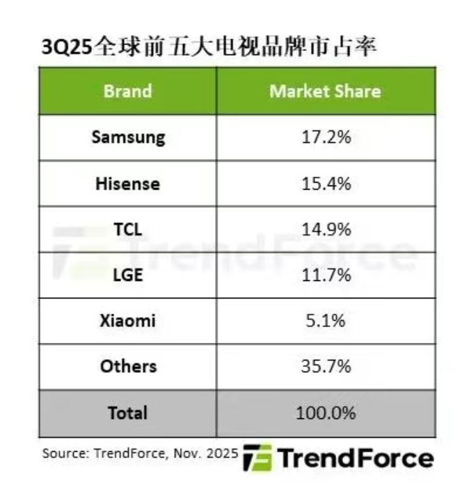 【环球网科技综合报道】11月3日消息,TrendForce集邦咨询最新发布的报告显示, 2025年第三季全球 电视出货量约为4975万台,季增6%、年减 4.9%。 据TrendForce集邦咨询预测,第四季欧美市场进入促销高峰,中国将迎来双11、双12备货潮,预期两大 中国品牌将作最后销售冲刺,预估第四季全球出货量将季增7.3%,达5321万台。 | Brand | Market Share | | --- | --- | | Samsung | 17.2% | | Hisense | 15.4% | | TCL | 14.9% | | IGE | 11.7% | | Xiaomi | 5.1% | | Others | 35.7% | | Total | 100.0% | | Source: TrendForce, Nov. 2025 | IrendForce | 从尺寸来看,TrendForce集邦咨询表示,随着全球电视市场尺寸结构持续放大,2025年60 吋(含)以上 电视出货占比首度达28.2%。品牌的销售策略重心正从"尺寸放大"转向"产品升级",未来市场将聚焦如 何透过RGB Mini LED、高 ...