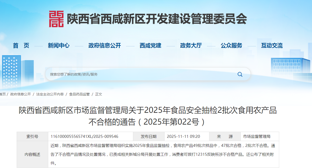 陕西省西咸新区市场监督管理局关于2025年食品安全抽检2批次食用农产品不合格的通告(2025年第022号)