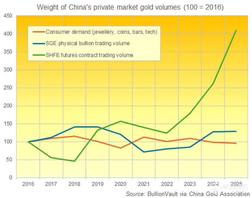 贵金属市场近期价格动态 - 周四黄金价格大幅下跌,本周迄今已下跌1.1% [1] - 周四白银价格大幅下挫,较上周五收盘价下跌12.8%,媒体称此为异常剧烈的波动 [1] - 上海白银期货合约今日下跌超过10%,广州期交所铂金合约跌幅近8%,上海锡期货下跌超过7% [2] - 伦敦黄金价格从4800美元/盎司上涨50美元至4850美元/盎司 [4] - 伦敦白银价格在周一4周低点基础上下跌60美分,跌破72美元/盎司,较上周四历史最高价下跌近50美元 [4] 中国黄金需求结构变化 - 2025年家庭黄金需求量降至950吨 [2] - 其中珠宝购买量按重量计算下降31.6% [2] - 零售金条和金币的销量则增长35.1% [2] - 零售投资产品的需求量达到饰品需求量的1.4倍,标志着家庭黄金购买行为出现重大转变 [2] 中国市场交易活动演变 - 过去十年终端用户黄金需求的年度总重量及上海金交所的黄金交易量重量保持相对稳定 [2] - 上海期交所的衍生品交易在过去三年中大幅增长 [2] - 通过上海期货交易所合约交易的黄金名义价值在2022年至2025年期间增长229.1% [2] 相关金融市场与产品表现 - 白银价格下跌潮伴随着美元反弹、比特币和美国股市同步走弱,以及国投白银LOF基金连续第四次下跌 [4] - 白银ETF再次以涨停价下跌,其在上证市场的股价下跌10%,且股东无法以参考价格买卖,该参考价比上周四历史最高点低超过三分之一 [4] - 看涨仓位过度拥挤在动荡市场环境下加剧了白银价格下跌 [4] - 中国股市周四再次下跌,较上个月同期下跌2.5% [4] - 摩根士丹利资本国际全球指数涵盖的西方股市已连续第三个交易日下跌 [4] 黄金ETF资金流向 - 2026年1月最后一周,亚洲黄金ETF持有量增加39吨,此前一周黄金价格创下5600美元/盎司历史新高后大幅下跌 [4] - 该流入量几乎是北美黄金ETF资金流入量的三倍,并超过了过去一年全球每周资金流入总量中除最强的四只之外的所有其他资金流入量 [5] - 在所有全球黄金支持的ETF中,亚洲上市基金所占比例在过去12个月里从6.8%跃升至12.0% [5] - 与欧洲上市的ETF中超过5吨的净减持形成鲜明对比 [5] 实时价格信息 - 截止北京时间09:40,华通现货白银定盘价报17110元 [5]
