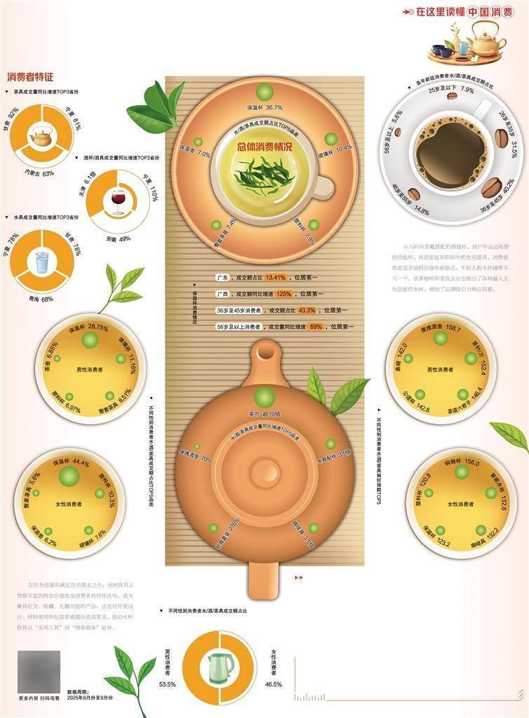 咖啡杯、随行杯、搅拌杯等场景化品类不断上新,满足消费者多样化的饮用需求。数据显示,女性消费者 偏好焖烧杯、智能水杯和咖啡具,男性消费者偏好公道杯、盖碗等器皿。同时,传统茶文化的浓厚氛围也 使茶具的衍生品颇受欢迎,包括茶巾、茶道六君子等。 健康和安全是消费者选购水杯饮具的首要考虑因素。例如,保温杯要选择304和316食品级不锈钢,玻璃杯 要选择耐热性强的高硼硅玻璃。通过与智能技术结合,水杯的功能也越来越丰富。一些保温杯可以实时显 示温度,避免水温过高烫伤;下载相关App可以设置喝水提醒,统计喝水量,查看喝水记录;还有水杯添 加指纹解锁功能,防止混用。 水杯饮具不只是容器,同时兼具文化属性。文创店内,印有联名IP图案的马克杯化身为纪念品;咖啡店 里,带有地标图景的咖啡杯吸引游客"打卡";下午茶时,一套精致的茶壶杯碟让美味充满仪式感……消费 者对水杯饮具的外观和内涵有了更高要求。 水杯饮具虽小,却与我们的生活方式息息相关。种类多样的水杯、茶具等传递了健康养生理念和特色文化 韵味,满足消费者的"使用价值"和"情绪价值"。未来,水杯饮具品类将继续向"功能复合化、场景定制化、 体验智能化"的方向创新研发。(本文来源:经济 ...
