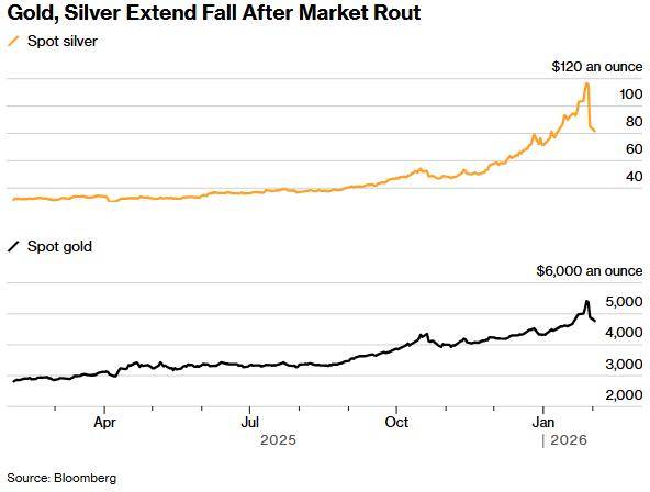 贵金属市场行情 - 贵金属市场遭遇重挫,金价连续下跌,延续了十余年来的最大跌幅,创纪录的暴涨行情因步伐过快、涨幅过大而大幅回调 [1] - 白银价格同步下挫,上周五黄金遭遇40年来最大下跌,白银创出历史最大盘中跌幅 [1] - 周一早盘交易中,现货黄金一度下跌多达4%,白银亦下跌相近百分比,勉强维持在每盎司80美元上方,盘中曾短暂跌至12%的跌幅 [1] 价格波动触发因素 - 上周五戏剧性抛售的触发因素在于,有消息称美国总统特朗普将提名凯文·沃什执掌美联储,这一消息推动美元走高 [4] - 交易员将沃什视为最终候选人中最强硬的反通胀斗士,这提高了对将支撑美元、削弱以美元计价贵金属的货币政策的预期 [4] - 此前,由于对地缘政治动荡、货币贬值以及美联储独立性的新担忧,投资者纷纷涌入黄金和白银,涨势在当年一月急剧加速 [4] 市场结构与交易动态 - 前摩根大通贵金属交易员、现任独立市场评论员罗伯特·戈特利布表示,关键在于这个交易实在太拥挤了,需要观察其能否找到支撑 [1] - 高盛集团在一份报告中指出,创纪录的看涨期权购买浪潮产生了“机械性强化价格上涨势头”的效果,因为期权卖方通过买入更多来对冲其对价格上涨的风险敞口 [4] - 飙升的价格和波动性已经令交易员的风险模型和资产负债表承压,为极端波动做好了准备 [4] 最新价格与指数表现 - 截至发稿,黄金下跌2.57%,至每盎司4740.53美元,白银下跌1.02%,至84.84美元,铂金和钯金下跌 [4] - 衡量美元走势的彭博美元即期指数在前一交易日上涨0.9%后持平 [4]