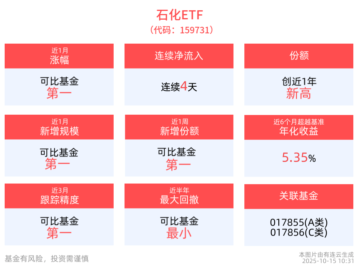 指数及ETF市场表现 - 截至2025年10月15日10:31,中证石化产业指数下跌0.22%,成分股金发科技、和邦生物、中复神鹰领涨,联泓新科、彤程新材、荣盛石化领跌 [1] - 石化ETF(159731)当日下跌0.38%,报价0.78元,近3月累计上涨14.72%,涨幅在可比基金中排名第一 [1] - 石化ETF近4天连续资金净流入,合计401.87万元,份额达6137.58万份,创近1年新高,近1月规模增长470.06万元 [1] - 截至2025年10月14日,石化ETF近6月净值上涨21.93%,自成立以来最高单月回报为15.86%,最长连涨月数为5个月,连涨涨幅22.33%,上涨月份平均收益率5.27% [1] - 石化ETF近6个月超越基准年化收益为5.35% [1] - 石化ETF近半年最大回撤4.36%,相对基准回撤0.14%,为可比基金中最小,回撤后修复天数为16天,近3月跟踪误差0.034%,跟踪精度最高 [2] 行业基本面与前景 - 基础化工行业需求稳定且全球供给主导,重点关注三氯蔗糖、农药、MDI、氨基酸等子行业 [2] - 内需驱动的制冷剂、化肥、染料等细分领域有望对冲关税冲击,其中磷肥、钾肥、复合肥及染料行业表现活跃 [2] - 周期底部逐步明确,供需边际改善的有机硅、氨纶等子行业因产能先投放或优先恢复 [2] - 1~8月化学原料和化学制品制造业利润总额同比下降5.5%,但双氧水、氢氟酸等产品价格强势上涨,主因装置集中检修及新能源需求支撑 [2] - 行业整体处于资本开支释放后的再平衡阶段 [2] 指数成分与ETF信息 - 石化ETF(159731)紧密跟踪中证石化产业指数,截至2025年9月30日,指数前十大权重股为万华化学、中国石油、盐湖股份、中国石化、中国海油、巨化股份、藏格矿业、金发科技、华鲁恒升和宝丰能源,合计占比55.12% [2] - 石化ETF场外联接基金为华夏中证石化产业ETF发起式联接A(017855)和联接C(017856) [3]