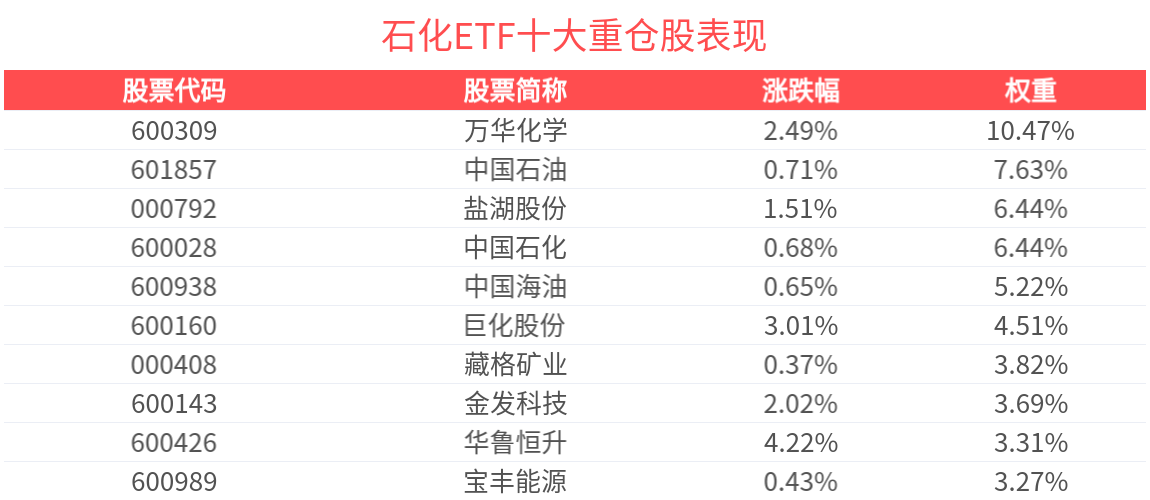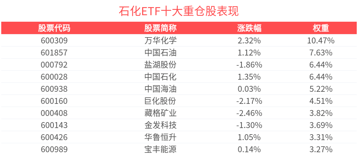 截至2026年1月13日9:48,中证石化产业指数强势上涨1.49%,成分股凯赛生物上涨11.71%,兴发集团上涨8.42%,盐湖股份上涨5.04%,藏格矿业,恒力石 化等个股跟涨。石化ETF(159731)上涨1.17%,最新价报0.95元。从资金净流入方面来看,石化ETF近4天获得连续资金净流入,合计"吸金"5772.28万元。石 化ETF最新规模达3.07亿元,创近1年新高。 | 股票代码 | 股票简称 | 涨跌幅 | 权重 | | --- | --- | --- | --- | | 600309 | 万华化学 | 1.92% | 10.47% | | 601857 | 中国石油 | 2.33% | 7.63% | | 000792 | 盐湖股份 | 5.04% | 6.44% | | 600028 | 中国石化 | 0.34% | 6.44% | | 600938 | 與歐圖出 | 1.71% | 5.22% | | 600160 | 巨化股份 | 0.57% | 4.51% | | 000408 | 藏格矿业 | 4.07% | 3.82% | | 600143 | 金发科技 | -3.44% | ...