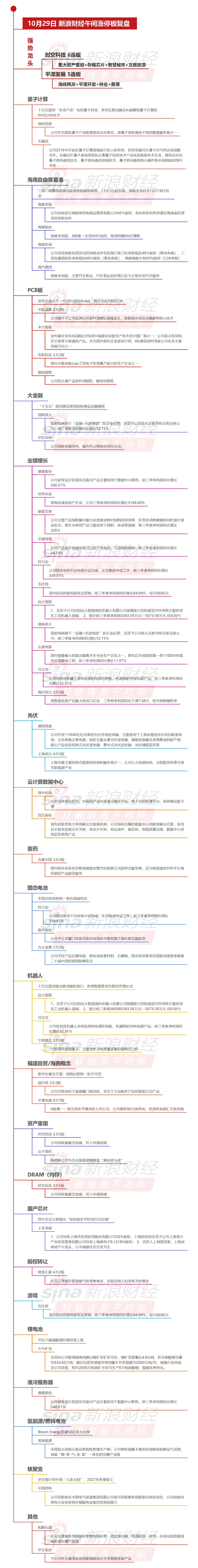 人工智能与先进计算 - 英伟达展示下一代GPU架构Rubin,预计出货2000万块 [2] - 本川智能是业内最早攻克5G基站天线用中高频多层板生产技术的少数厂商之一,公司布局低空卫星等卫星通信产品并为国内相关企业研发打样,6G通信用PCB是公司未来主要发展方向之一 [2] - 淳中科技与英伟达合作,对接产品包括液冷测试平台、基于AI的检测平台、各种测试板卡 [3] 半导体与PCB产业链 - 中钨高新旗下子公司金洲公司是PCB微钻领域龙头,具备极小径钻头精磨等核心技术 [2] - 宏和科技是国内少数具备Low CTE电子布等量产能力的生产企业之一 [2] - 铜冠铜箔主要产品是PCB铜箔、锂电池铜箔 [2] 金融与证券 - “十五五”规划建议提到加快建设金融强国 [2] - 国网英大是国家电网旗下“金融+先进制造”双主业运营公司,全资子公司英大证券为综合类证券公司,前三季度净利润同比增长53.73% [2][3] - 华安证券深耕安徽市场,省内市占率保持30%左右 [2] 业绩高增长公司 - 康盛股份研发设计的浸没式液冷产品主要应用于数据中心散热,前三季净利润同比增长240.21% [2][6] - 世荣兆业是珠海区域房地产企业,公司三季报净利润同比增长3168.80% [2] - 蔚蓝生物主要产品饲料酶可最大化挖潜动物对饲料利用率,微生态制剂产品应用于饲料、农业等领域,第三季度净利润同比增长205% [2] - 科力远固态电池干法电极小试完成,正在推进中试工作,前三季度净利同比增长539.97% [3][4] - 吉比特是国内知名游戏研发运营商,前三季度净利润同比增长84.66%,拟10派60元 [3][5] 电力设备与新能源 - 长高电新是国内规模最大的高压隔离开关专业生产企业之一,曾为我国第一条1100kV特高压交流输电工程供货,前三季净利润同比增长11.97% [3] - 海兴电力是国智能电表产品最大出口企业,三季报净利润同比下滑7.48%,较中报降幅收窄 [3] - 四方股份是领先的新型电力系统解决方案提供商,具有完整的数据中心供配电解决方案,采用自主研发的高压开关柜、低压开关柜等产品 [3] - 上海电力是上海市最主要综合能源供应商之一,公司大力发展风电、太阳能发电等可再生新能源产业 [3] 光伏与储能 - 通润装备开发110kW左右功率光伏并网逆变器,主要应用于工商业屋顶光伏项目,公告收购正泰电源,标的主要从事光伏逆变器、储能变换器及系统集成 [3] - 中国西电控股股东中国电气装备集团有限公司是可控核聚变创新联合体成员,公司具备向核电行业供应相关输配电设备资质和能力 [6] 机器人与智能制造 - “十五五”规划提出推动脑机接口、具身智能等成为新经济增长点 [4] - 远大智能全资子公司沈阳远大智能高科机器人有限公司高精度力控和视觉引导系统主要应用在工业机器人领域,预计前三季度净利润3383.59万元—5073.59万元,同比扭亏 [3][4] - 可立克供应机器人充电站里的电源控制板、机器狗的充电电源产品,前三季度净利润同比增长52.51% [3][4] - 宁波精达主要业务为换热器装备和精密压力机 [4] 电池技术 - 半固态电池将统一更名固液电池 [4] - 振华股份子公司厦门首能半固态电池技术路径属于原位聚合凝胶型 [4] - 方大炭素支柱产品石墨电极、核电用炭素材料、石墨烯、固态电池等系列创新成果曾参展第二十届中国西部国际博览会 [4] - 节后六氟磷酸锂价格持续上涨 [5] 锂电池资源 - 大中矿业全资孙公司取得湖南鸡脚山锂矿采矿许可证,锂矿资源量达4.9亿吨,折合碳酸锂当量约324.43万吨,露天开采规模为2000万吨/年,每年2000万吨原矿开采可生产8万吨碳酸锂 [5] 资产重组与股权变动 - 时空科技拟收购嘉合劲威,切入存储领域 [5] - 山子高科媒体称公司为合众新能源重整案“意向参与者” [5] - 德龙汇能主营城市管道燃气和零售商业,实际控制人拟变更为孙维佳 [5] - 平潭发展是A股唯一一家注册在平潭岛的上市公司,公司拥有90万亩林地,受益林业碳汇交易发展 [5] 其他行业与公司 - 华通线缆产品海洋探测电缆可用于海底油、气资源勘探,第三季度净利润同比增长44.13% [3] - 合富中国是国内较早在体外诊断领域提出集约化销售方式的综合服务商,还为医院提供SPD平台商所做的产品配送服务 [4] - 上实发展持有上海市信息投资股份有限公司20%股权,上海信投全资子公司持有上海微电子8.1218%股权,实控人上海国资委,是上海崇明地产小龙头 [5] - 和顺石油主营业务为加油站零售连锁经营、成品油仓储、物流配送、批发,在成品油流通领域形成完整产业链 [6] - 本互股份子公司华立康茂应用鸿蒙智联技术开发智能家居产品 [6] - 美锦能源是全国较大独立商品焦和炼焦煤生产商,拥有储量丰富优质煤炭和煤层气资源,具备“煤-焦-气-化-氢”一体化完整产业链 [6]