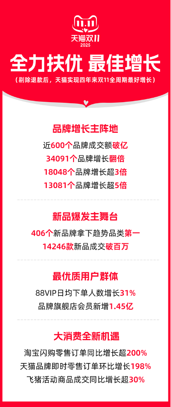 总体增长表现 - 2025年天猫双11全周期实现四年来最好增长,剔除退款后成交额创四年新高 [1][2] - 近600个品牌成交额突破1亿元,品牌增长表现强劲,其中苹果、海尔、美的等10个品牌成交额突破10亿元 [1] - 34091个品牌同比增长翻倍,18048个品牌同比增长超3倍,13081个品牌同比增长超5倍,均超去年同期水平 [1] 品牌与新品类表现 - 406个新品牌拿下趋势品类第一名,26个新品牌成交破亿元,188个新品牌成交破千万元 [2] - 14246款新品成交破百万元,破亿元单品中新品占比达30% [3] - iPhone 17 Pro Max、娇韵诗第九代黄金双萃等多款新品首秀即成交破亿元 [3] 业务板块与用户增长 - 飞猪成交创历史新高,同比增长超30%,淘宝闪购零售订单同比增长超2倍 [2] - 天猫品牌即时零售日均订单环比9月增长198% [2] - 88VIP会员规模创新高,日均下单购买人数同比增长31%,品牌旗舰店会员新增1.45亿人 [3] 平台战略与技术应用 - 平台实施"扶优"战略,资源向高质量消费者和原创高质量商家倾斜 [11] - 首次规模化启用AI"智惠引擎"决策发放红包,AI红包带动品牌日均下单用户数增长86% [2] - 平台体系全面优化,包括算法、产品能力与经营方式革新,AI深度整合提升经营和营销效率 [10] 闪购业务发展 - 闪购业务成为新增长引擎,目前约3.7万家品牌、40万家门店接入,涵盖华为、优衣库等知名品牌 [10] - 闪购实现从餐饮外卖到服饰数码等多品类全面覆盖,依托平台与品牌共生优势打造新增长引擎 [10] - 闪购带来用户结构变化,吸引年轻用户与高消费人群,助力平台破圈 [10]