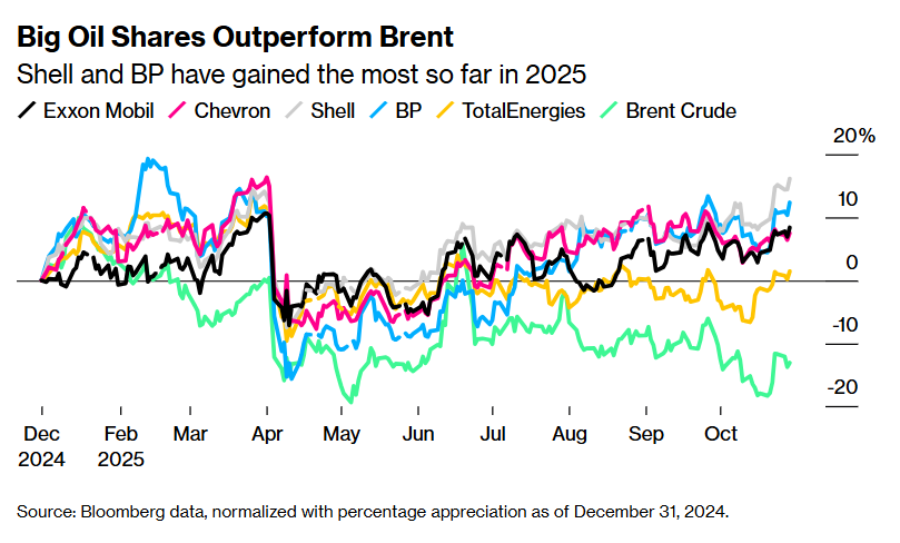 美国油气巨头雪佛龙公司(CVX.US)在将以530亿美元收购同行赫斯公司带来的利润首次完成并表之后,大幅提升了 石油产量和自身现金流,从而在这一轮原油价格长期疲软的周期中实现了盈利数据超出预期,并且公司现金流来到 重大的扩张拐点。 财报数据显示,雪佛龙Q3营收为497.3亿美元,同比下降1.9%,较预期高出23.1亿美元。净利润约为36亿美元,同 比下降20%,但是雪佛龙经调整的第三季度每股收益为1.85美元,超过华尔街分析师们平均预期的1.66美元。这家 美国油气霸主与其最大规模竞争对手之一——来自欧洲的竞争对手壳牌,均公布了强于预期的业绩,另一美国能源 巨头埃克森美孚也公布了强于预期的利润。 随着欧佩克及其盟友持续增加石油供应,国际原油基准——布伦特原油价格正朝着五年来最大年度跌幅的方向发 展,这种持续增产带来的"供应过剩预期"以及油价疲软,可谓大幅削弱了石油行业在新冠疫情之后获得的丰厚利润 以及美国总统唐纳德.特朗普的亲传统能源行业监管体制的光环。 低油价、高波动性以及对地球储量有限的化石燃料未来的担忧情绪意味着,尽管美国已成为世界最大规模的石油和 天然气生产国,能源板块在标普500指数中的权重如今仍不 ...