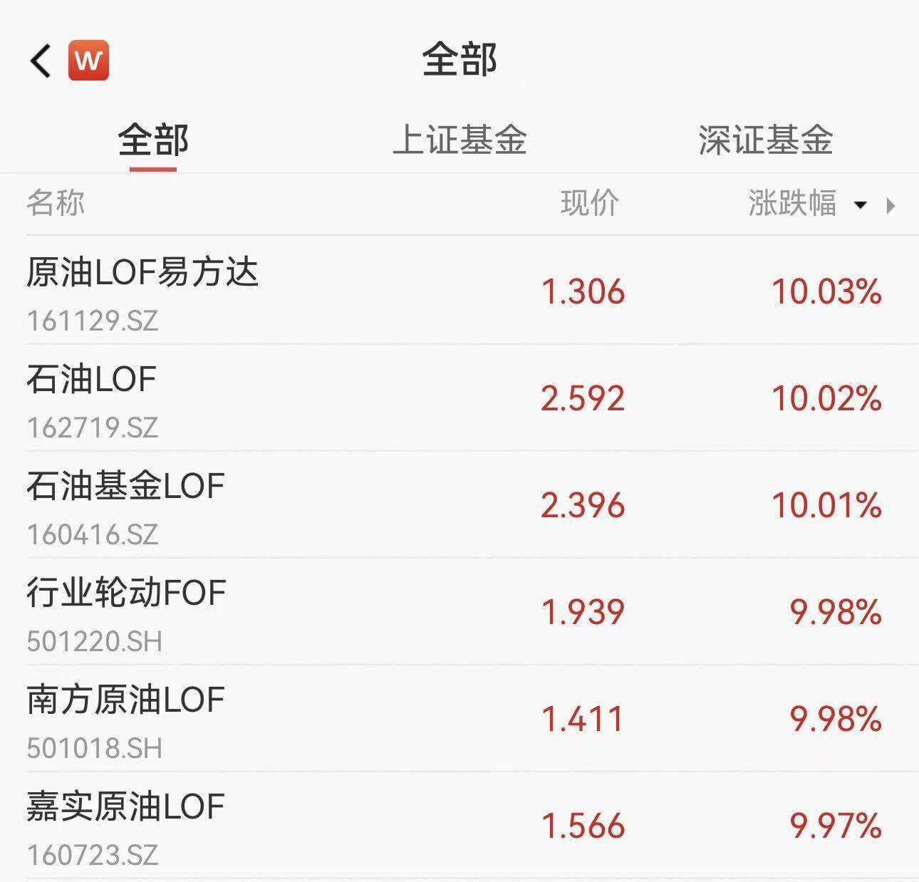 | ( W | 충耶 | | | | --- | --- | --- | --- | | を部 | 上证基金 | | 深证身 | | 名称 | | 现价 | 涨 | | 原油LOF易方达 | | 1.306 | | | 161129.SZ | | | | | 石油LOF | | 2.592 | | | 162719.SZ | | | | | 石油基金LOF | | 2.396 | | | 160416.SZ | | | | | 行业轮动FOF | | 1.939 | | | 501220.SH | | | | | 南方原油LOF | | 1.411 | | | 501018.SH | | | | | 嘉实原油LOF | | 1.566 | | | 160723.SZ | | | | 图片来源:Wind Wind数据显示,1月28日,截至14:00,原油LOF易方达、石油LOF、石油基金LOF、南方原油LOF、嘉实原油LOF等油气主题LOF集体涨停。其中,石油基 金LOF溢价率超30%,南方原油LOF溢价率超20%,其余油气主题LOF溢价率也在10%以上。 1月27日晚间,华安基金发布公告称,为保证基金的平稳运 ...