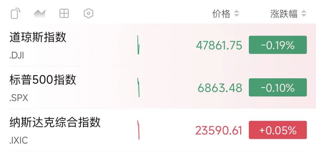 | 0 | ~ 田 | 0 | 价格 = | 涨跌幅 ◆ | | --- | --- | --- | --- | --- | | 道琼斯指数 | | | 47861.75 | -0.19% | | .DJI | | | | | | 标普500指数 | | | 6863.48 | -0.10% | | .SPX | | | | | | 纳斯达克综合指数 | | | 23590.61 | +0.05% | | .IXIC | | | | | 又有个股暴涨。 当地时间12月8日,美股三大股指早盘涨跌不一,截至发稿,道指跌0.19%,标普500指数跌0.1%,纳指微涨0.05%。 消息面上,本周美联储联邦公开市场委员会(FOMC)将公布利率决议。芝商所"美联储观察"工具显示,市场预计降息25个基点的概率为89.6%,按兵不 动的概率仅略高于10%。 白宫经济顾问哈塞特就美联储发表看法称,应该继续降低利率。关于利率应降至多低的问题,他表示必须密切关注数据情况。他还表示,若现在就公布未 来6个月的利率承诺,将是不负责任的行为。 野村发布最新报告称,预计美联储12月还是会选择降息25个基点。野村策略师表示:"对美联储中间派 ...