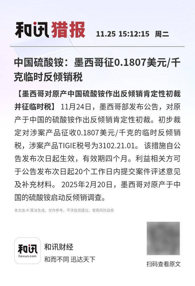 中国硫酸铵:墨西哥征0.1807美元/千克临时反倾销税